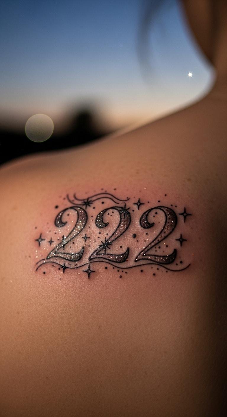 A 222 with stars tattoo brings celestial luck and unity. Stars represent guidance, adding a dreamy touch.