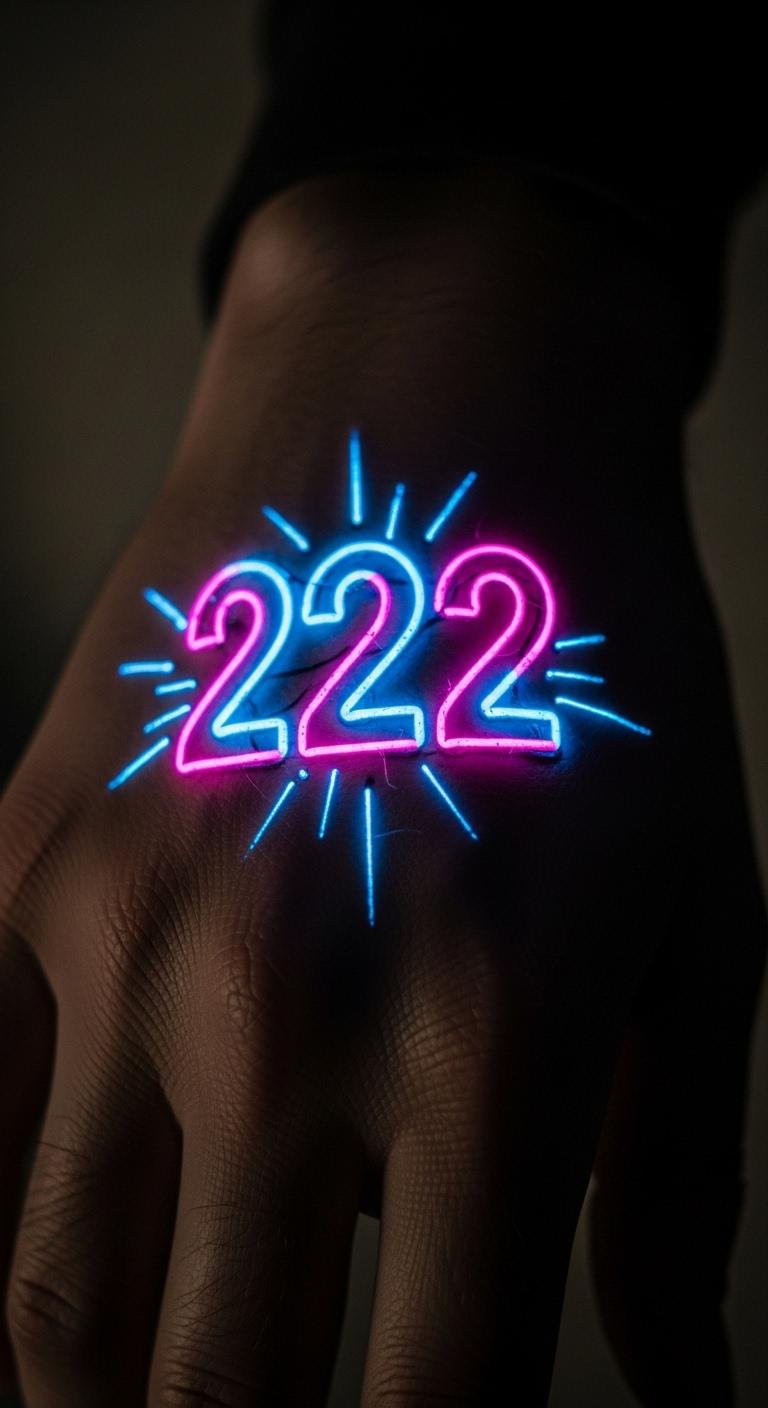 A neon 222 glow effect tattoo radiates luck and unity. Bright lines make it pop, like a night light.