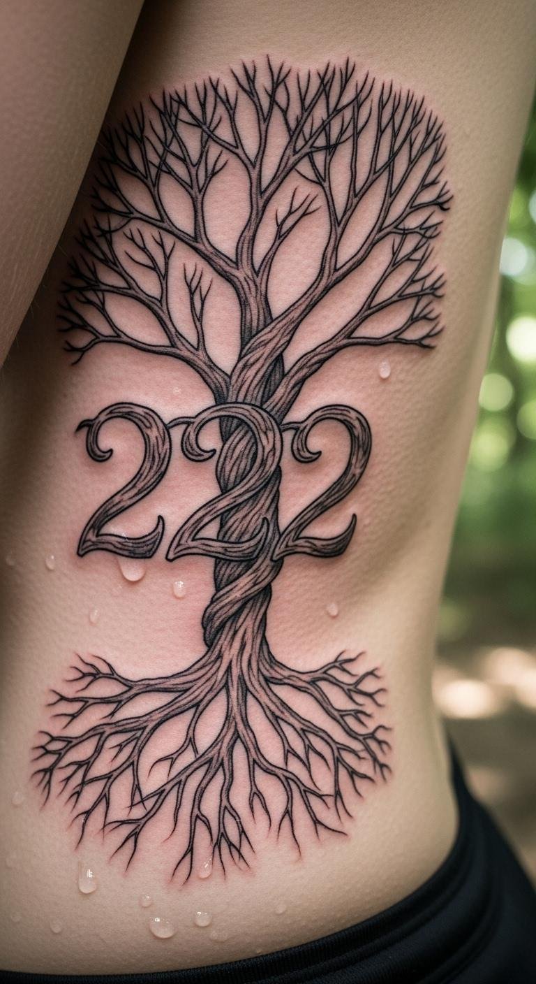 A 222 tree of life tattoo grounds luck and unity. Branches represent growth, like a family tree.