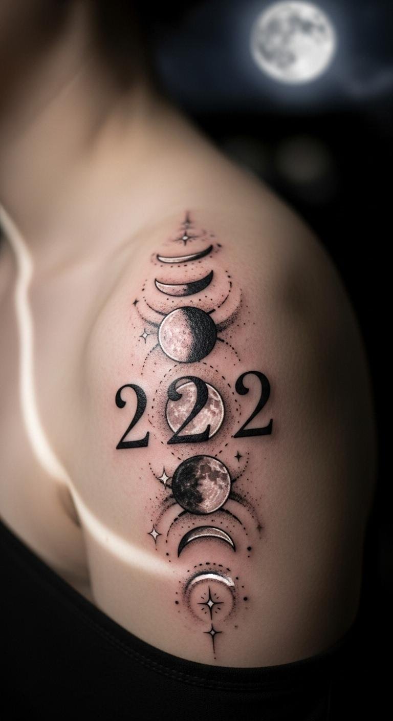 A 222 with moon phases tattoo cycles luck and unity. Moons represent change, like personal rhythms.
