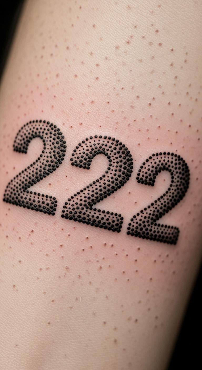 A dotwork 222 tattoo dots luck and unity. Small points build a bigger picture, like piecing together dreams.