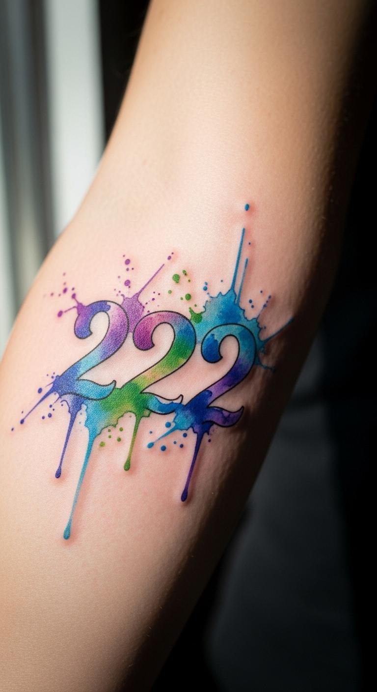 A watercolor 222 tattoo offers a soft, artistic take on luck and unity. The colors blend like emotions, making it feel alive and personal.