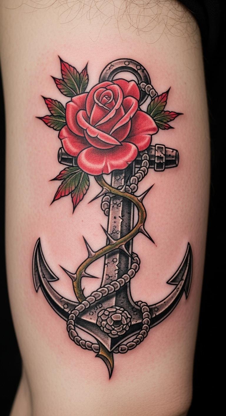 Add a rose to your anchor for beauty and strength together. See the flower wrapping around for a balanced look. Draw combinations at home with colored pencils. Find rose-anchor pairs on free sites. Put it on your arm for clear display. Use red and black ink sparingly. This design means tough grace in life. Try paper sketches with your supplies. Opt for a modest size to save money. It blends elegance with power.
