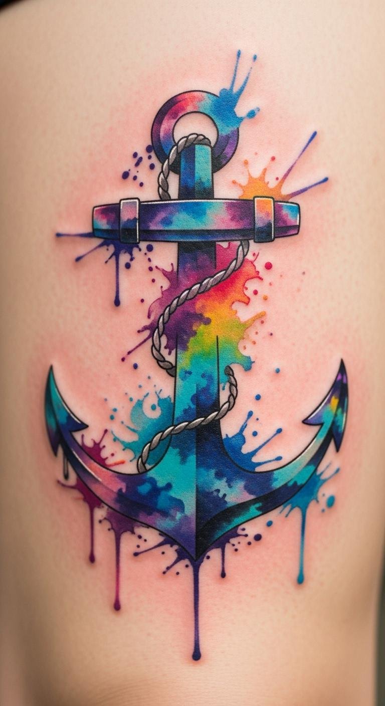 Watercolor anchors offer a painted, artistic feel to strength. Imagine soft blues and grays blending like art. Create a mock-up with watercolors from your craft kit. Find inspiration on free art platforms. Place it on your thigh for a personal touch. Use fewer colors to cut expenses. It symbolizes fluid adaptability in hard times. Try DIY washes on paper first. Opt for a medium design to balance cost and impact. This style makes your tattoo uniquely yours.