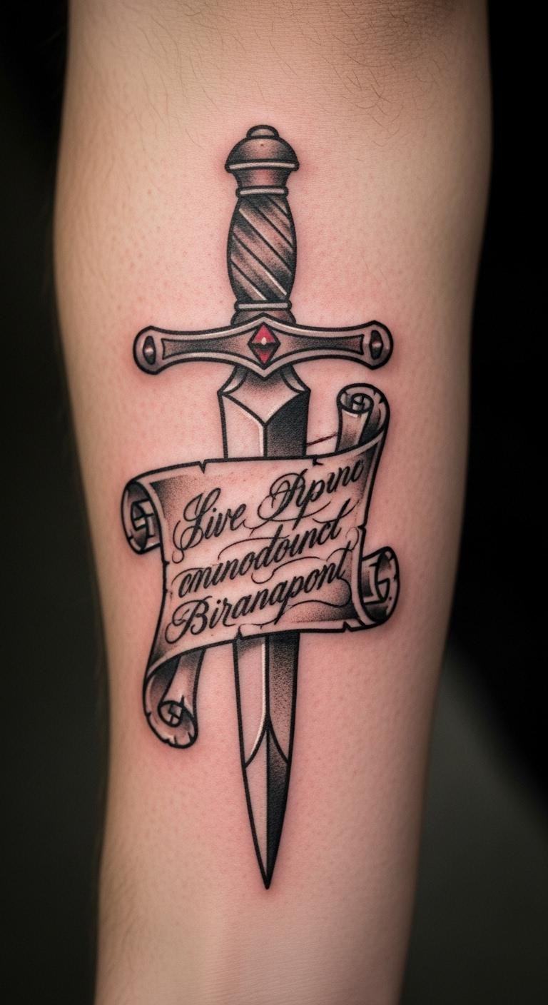 Dagger tattoos represent defense and courage in classic form. Opt for straight blades and basic accents. Choose your arm for practicality. Find artists with hourly rates—keep it to one hour for $100. Add a heart for contrast. Draw daggers on paper to refine ideas. They maintain shape well, standing strong. This is a straightforward, affordable pick.