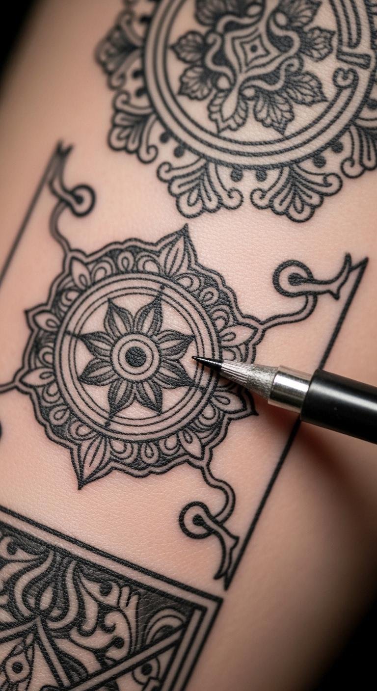 Mandala tattoos offer spiritual balance through repeating patterns. Stick to clean lines for a timeless vibe. Position it on your upper arm for easy viewing. Look for affordable sessions at community events—often $100 or so. Customize with cultural symbols that matter to you. Trace mandalas on paper to plan the size. They heal well and hold meaning deeply. This design is a practical way to find inner peace.