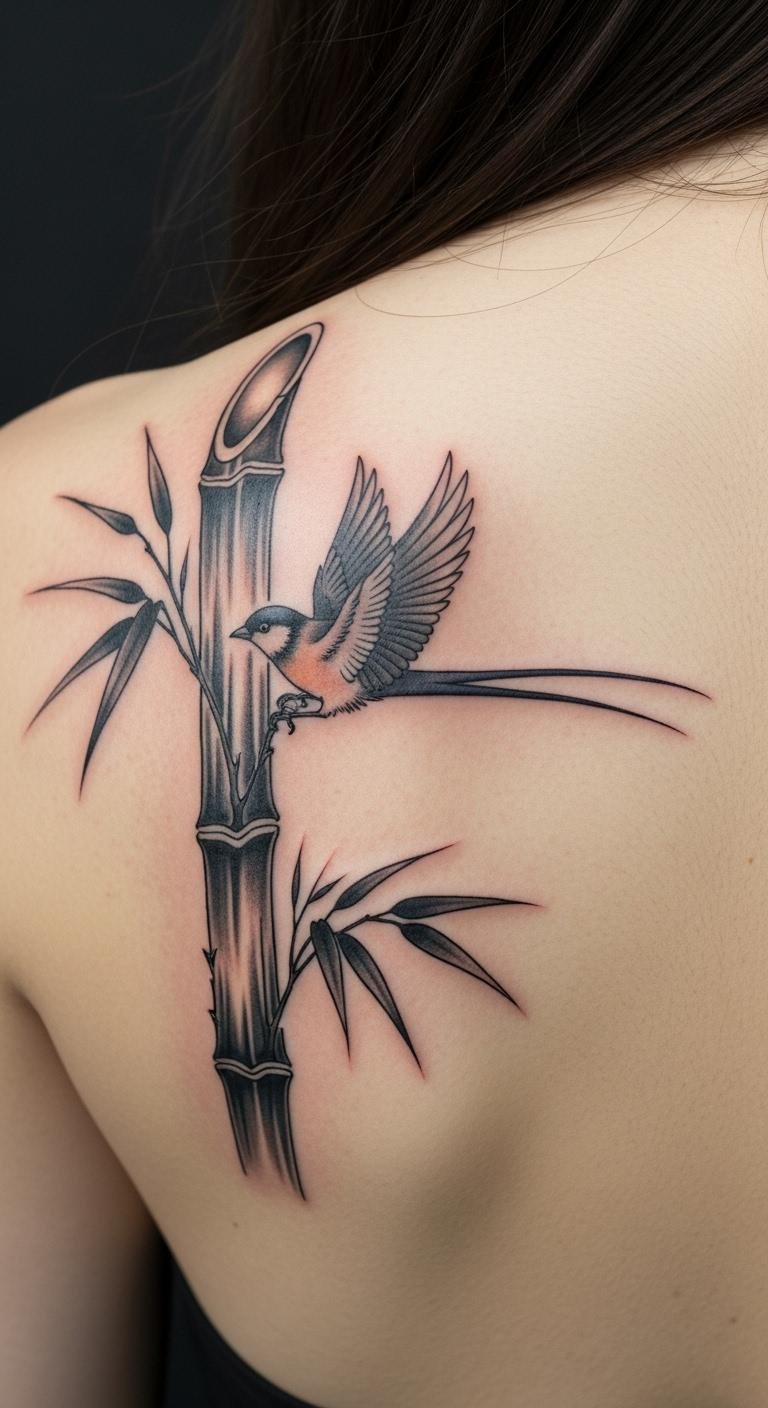 Integrate bamboo with a bird for freedom and growth. The bird sits on the stalk for a lively scene. Draw birds and bamboo on paper. Seek out nature combo deals. For instance, add wings extending out. This adds story without high costs. Place it on your shoulder for movement. Use sketches to plan. Choose basic inks for savings. Test with drawings first.