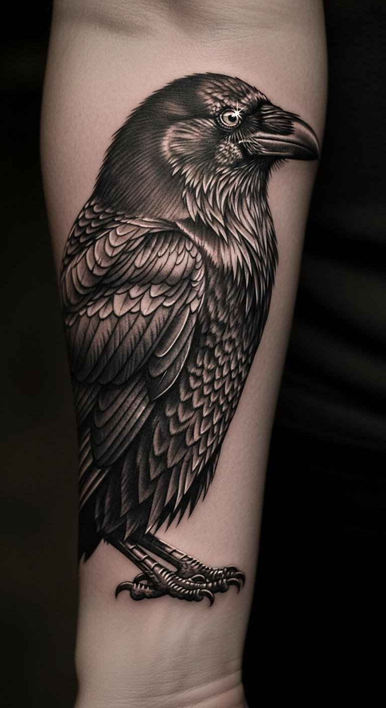 Crow tattoos mean smart adaptations. They’re for quick thinkers. Download free designs. Sketch easily. Include tools for smarts. Smart adaptations aid growth. Put it on your hand. Check for affordable spots. Use paper first. This keeps it simple.