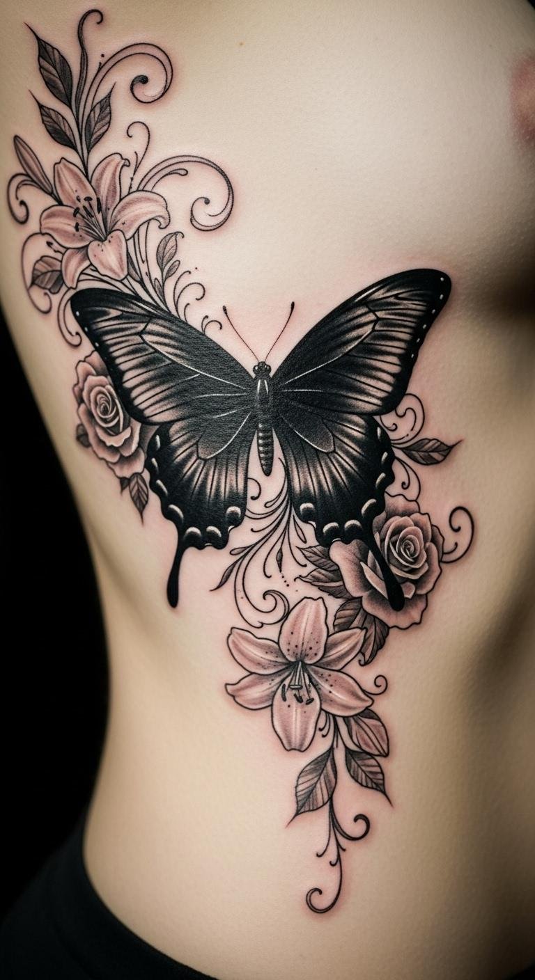 Add flowers to a black butterfly for nature’s touch. Sketch on paper; supplies at $5. This merges themes smoothly. Find floral pros; costs around $100. Choose a hidden spot. Use petals for inspiration. Black ink blends well. Book carefully. This idea grows your story.