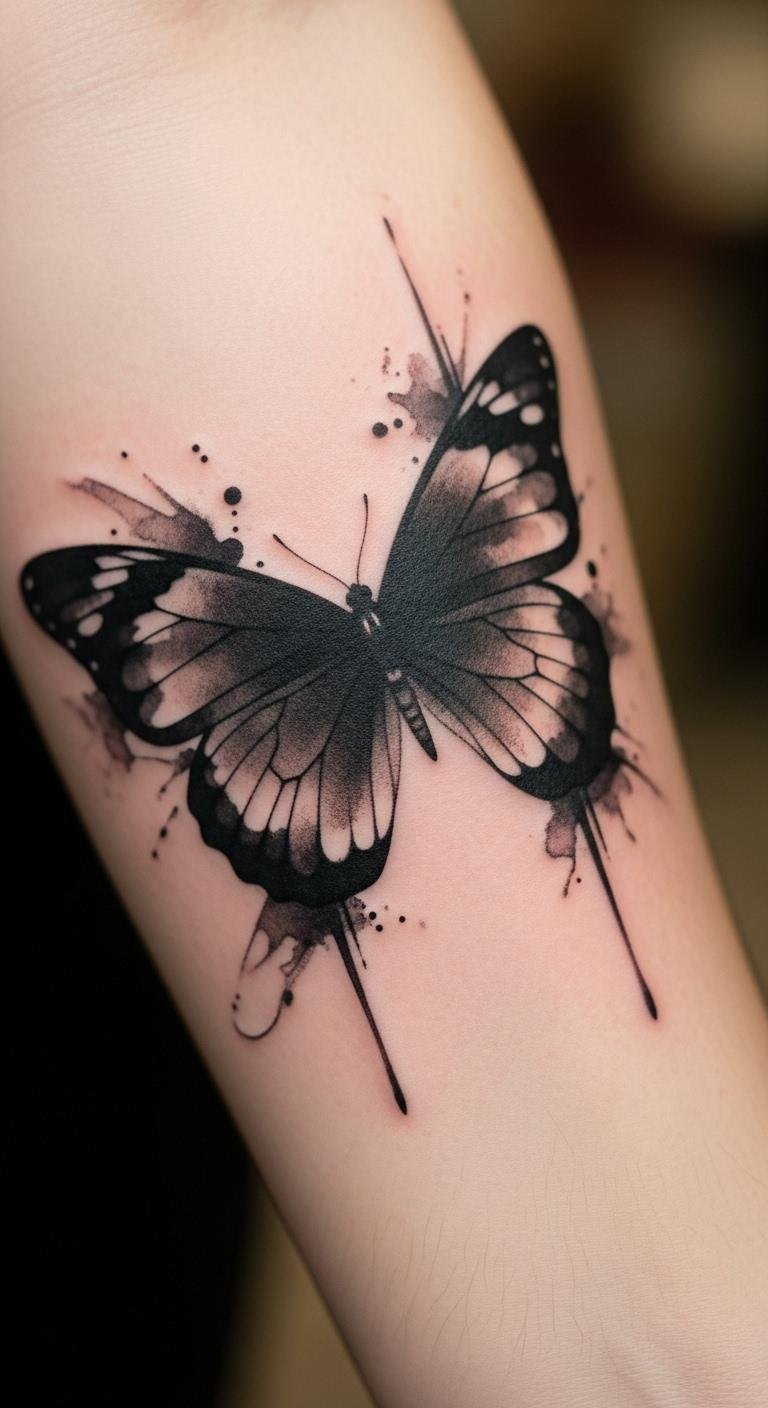 Watercolor shades bring a soft twist to black butterflies. Imagine blended edges on your forearm, like a painting on skin. Practice with watercolors and paper at home; materials cost about $10. This helps mimic the flow before ink. Keep it simple for a unique feel. Search for artists with shading skills on social sites; prices start at $80. Put it on an arm for easy viewing. Use a sponge for your DIY mock-up to test blending. Black with light shades prevents quick fade. Plan for a quick session. This style adds creativity to your routine.