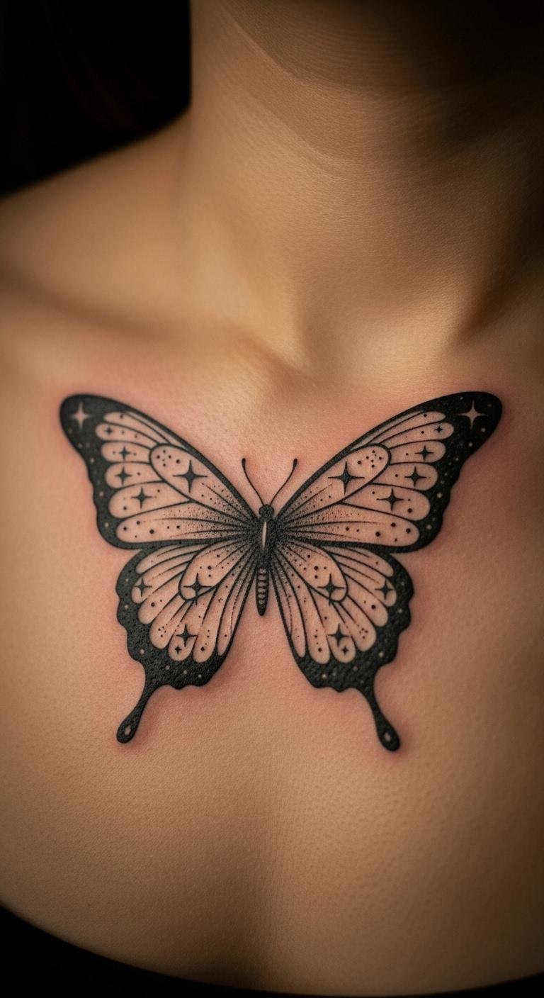 Stars in a black butterfly add a cosmic feel. Place it on your collarbone for that starry link. Draw stars around a butterfly shape with a pencil; supplies are cheap at $2. This lets you adjust the layout easily. Find artists who mix themes; costs could be $70. Position it for peeks of wonder. Use stencils for your home tryout. Black ink keeps the stars bright. Pick a calm day for the session. This design connects your story to the sky.