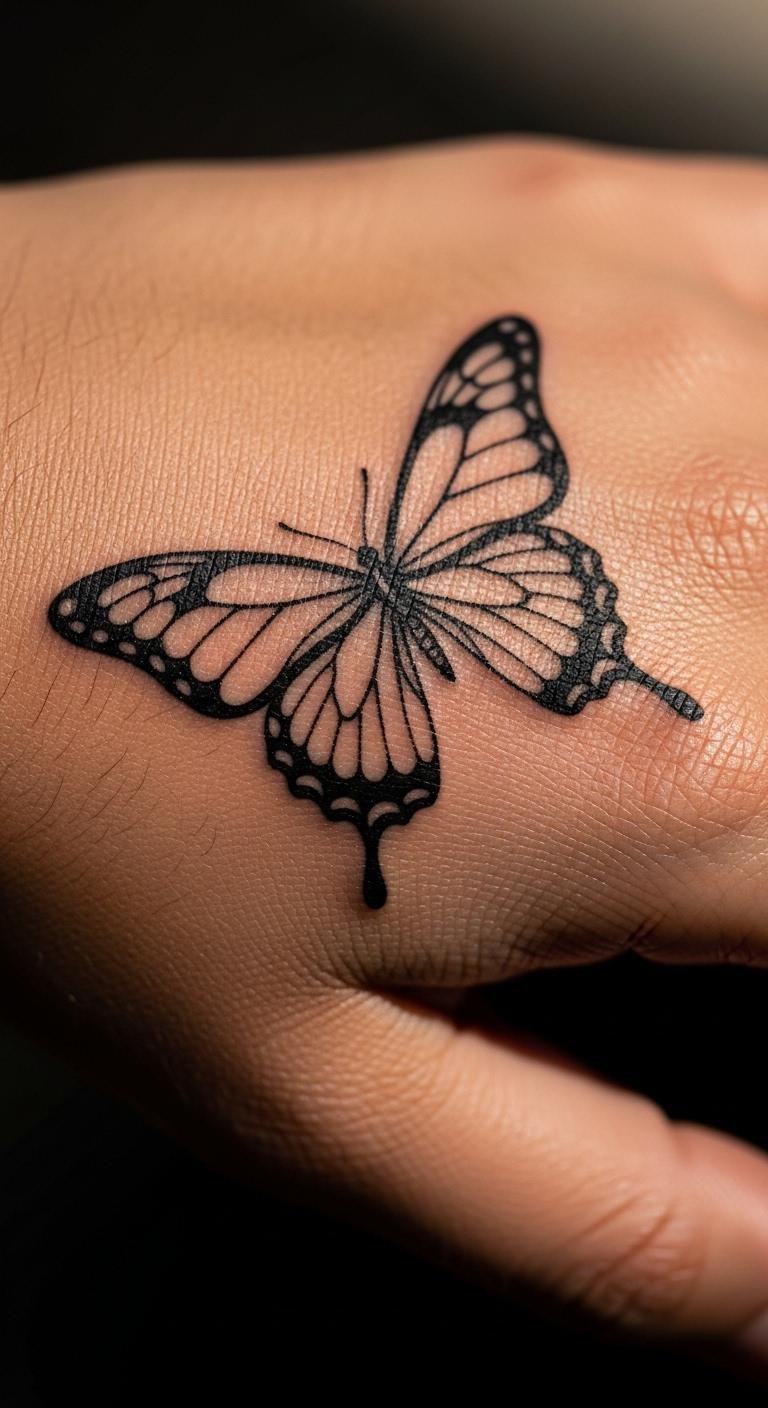 A black butterfly on your hand shows off confidence. Draw a small one with a pen; it’s free and quick. This spot draws eyes to your story. Check for artists near you; sessions might cost $60. Protect it with gloves if needed. Use henna for a temporary test at home. Black ink stays sharp here. Choose a less busy day. This placement makes a bold statement.