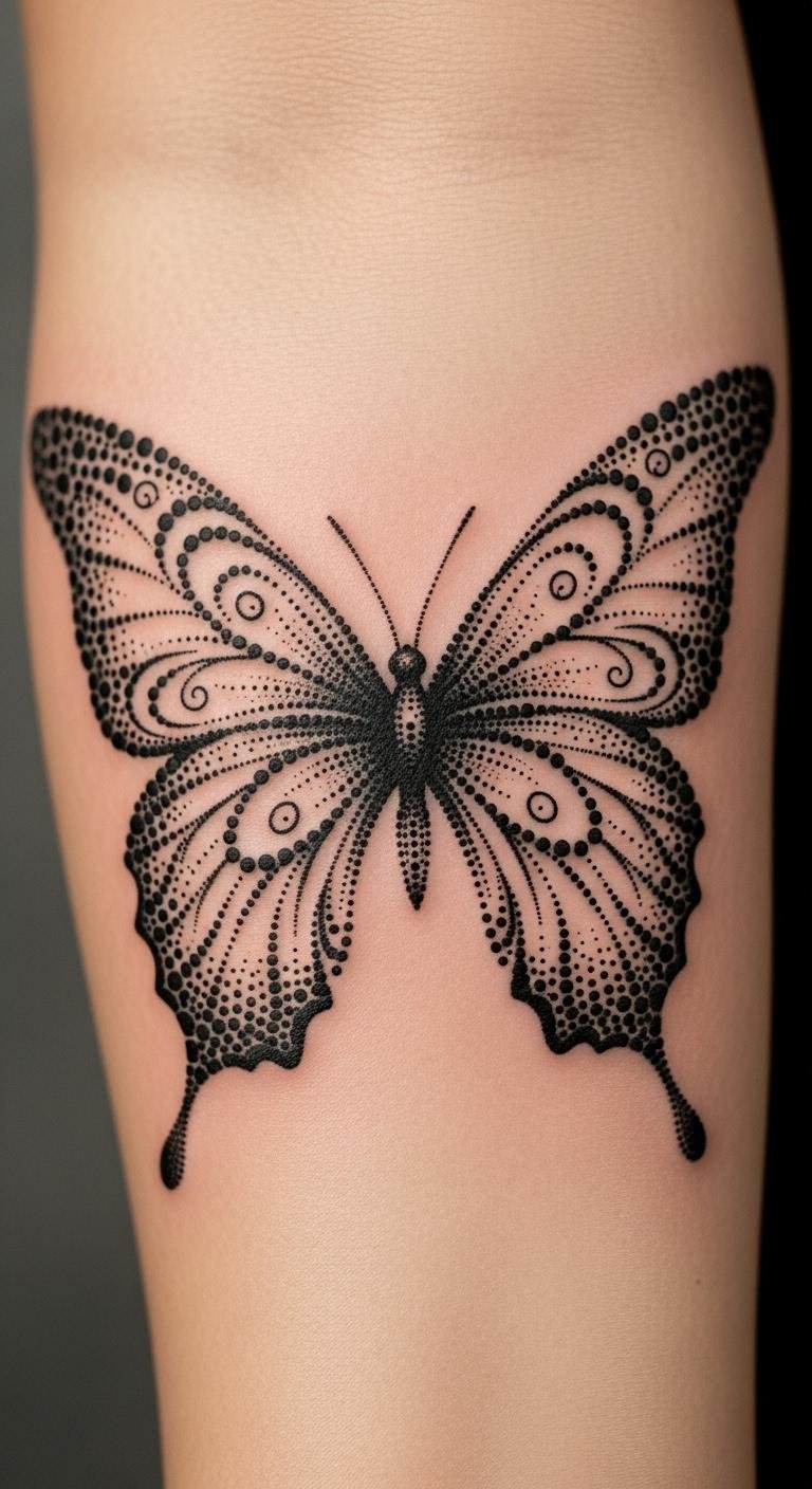 Dotwork creates an abstract black butterfly vibe. Dot it on paper at home; markers are cheap. This builds your custom look. Look for dot experts; fees start at $80. Place for personal view. Use a dot tool for trials. Black ink keeps dots clear. Plan ahead. This style adds texture to your ink.