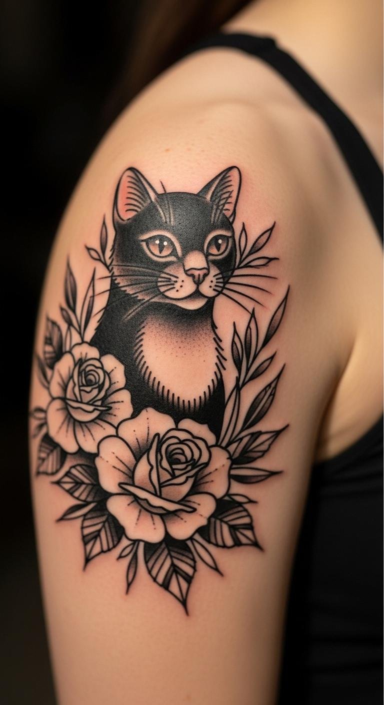 Choose a bold traditional black cat for timeless appeal. It stands out strong. Draw thick-lined cats on paper first. Use a bold marker from home. This helps plan without spending. Check traditional art resources online. Put it on your bicep for impact. Prices might hit $150. Emphasize strong outlines. Try bold drawings with permanent markers for a test. It’s straightforward and free. This style lasts through trends.