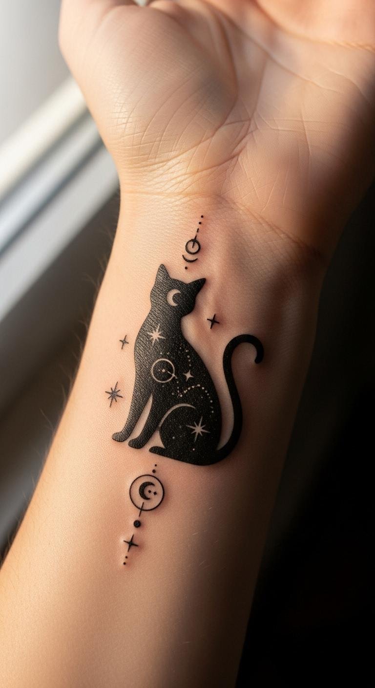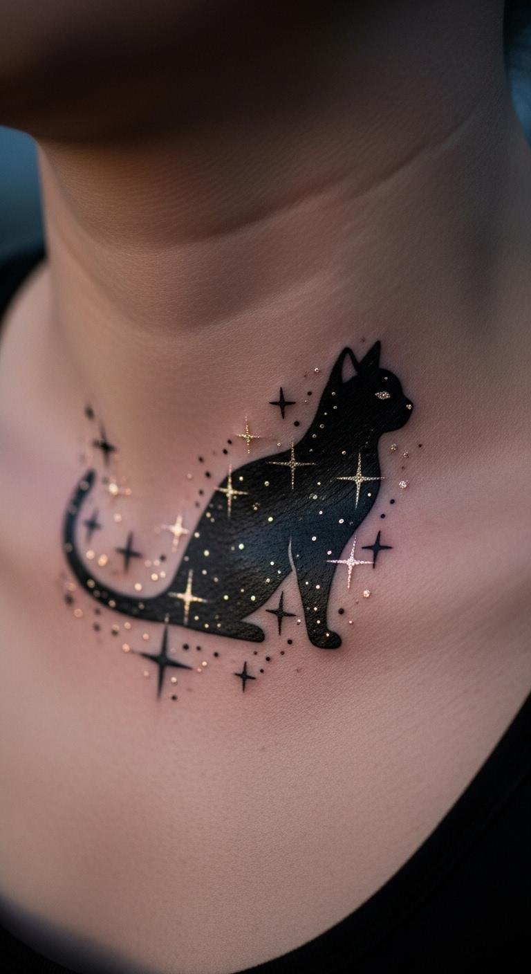 Incorporate stars around a black cat for a celestial touch. It feels magical. Draw a cat with star dots on paper. Use a pencil for accuracy. No extra tools needed. Look up star patterns online for inspiration. Place it on your collarbone for a subtle glow. Artists may charge around $160. Focus on even star placement. Experiment with stickers on your skin first. They’re cheap and easy to remove. This design sparks wonder every day.