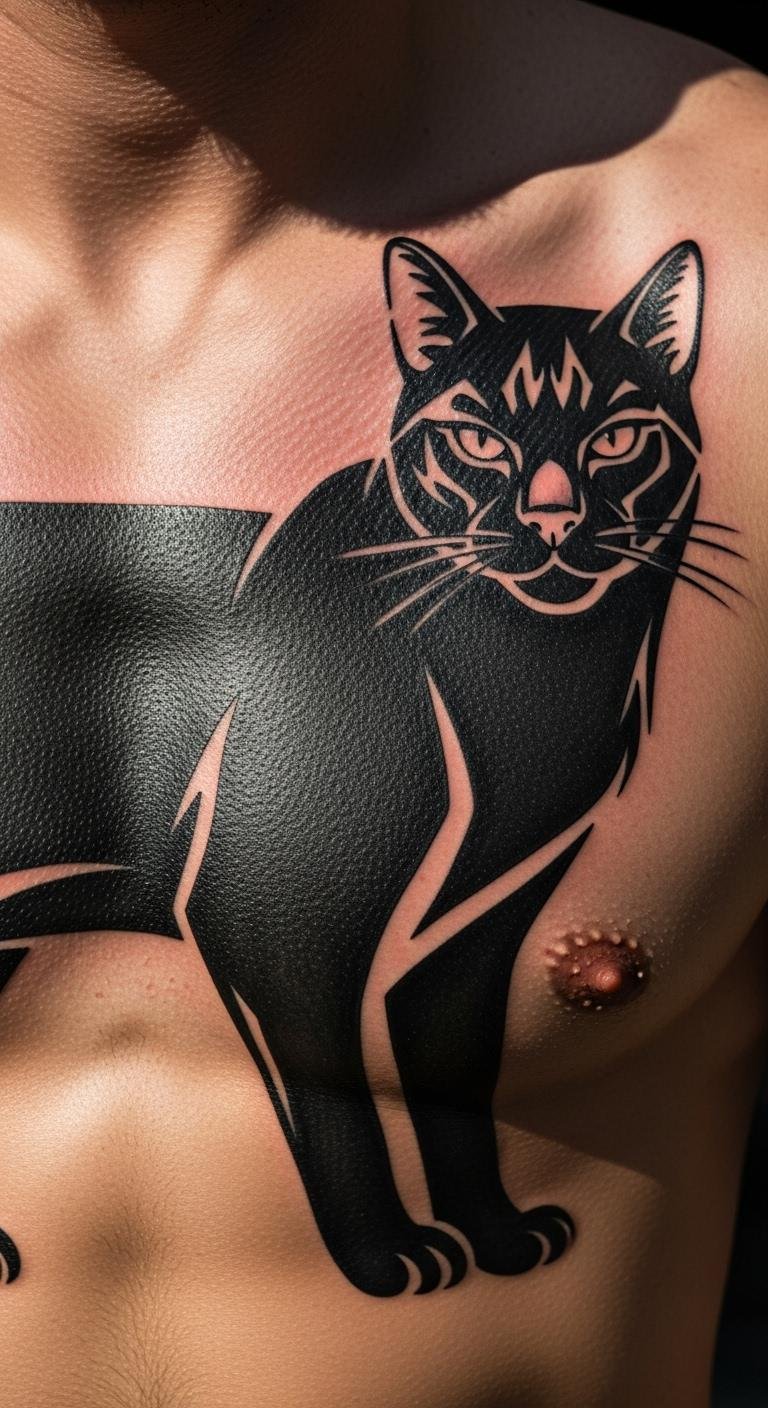 Go bold for a masculine black cat tattoo. It commands attention. Draw large, thick designs on paper. Use bold markers. From your supplies. Find bold art online. Place on your chest. Prices around $170. Emphasize strength. Use large stencils for practice. Easy and free. This tattoo shows power.