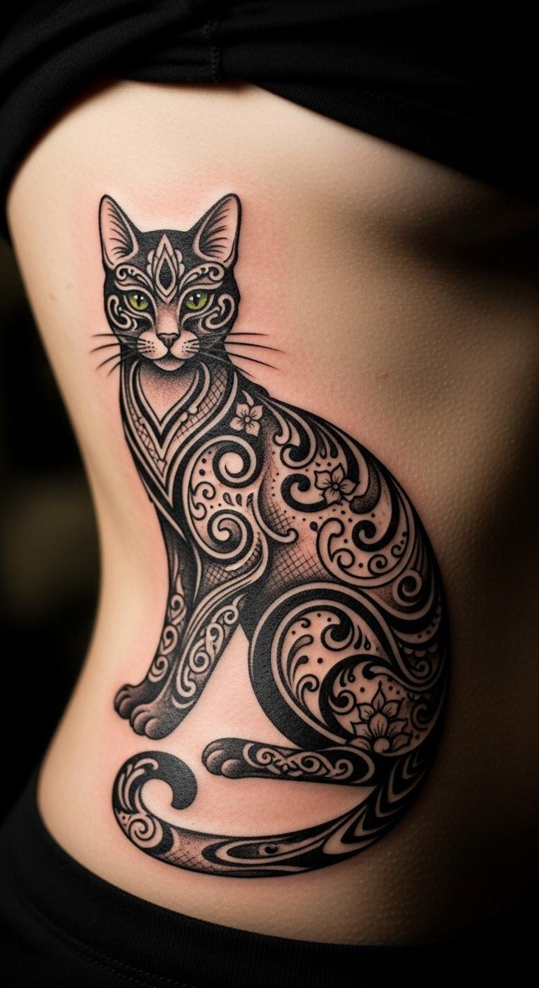 Master ornate lines in your black cat tattoo. It’s intricate and beautiful. Practice lines on paper. With a fine pen. From home. Find line art online. Tattoo on your side. About $160. Build up details. Use string for line practice. Simple and free. This design stands out.