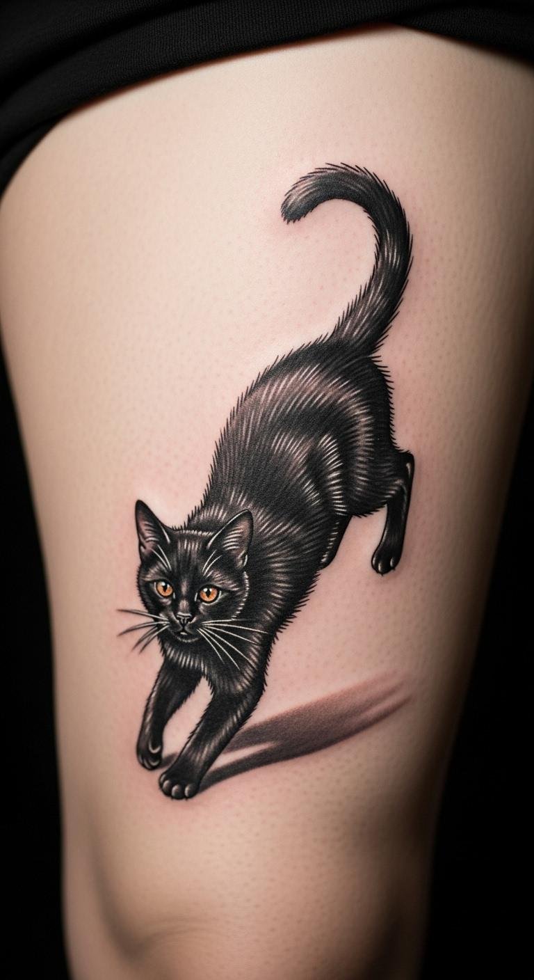 Try playful poses for your black cat tattoo. It adds movement. Draw different poses on paper. Use your markers. This is budget-friendly. Get pose ideas online. Put on your thigh. Prices $130. Experiment with angles. Pose with toys for inspiration. Fun and free. This tattoo brings joy.