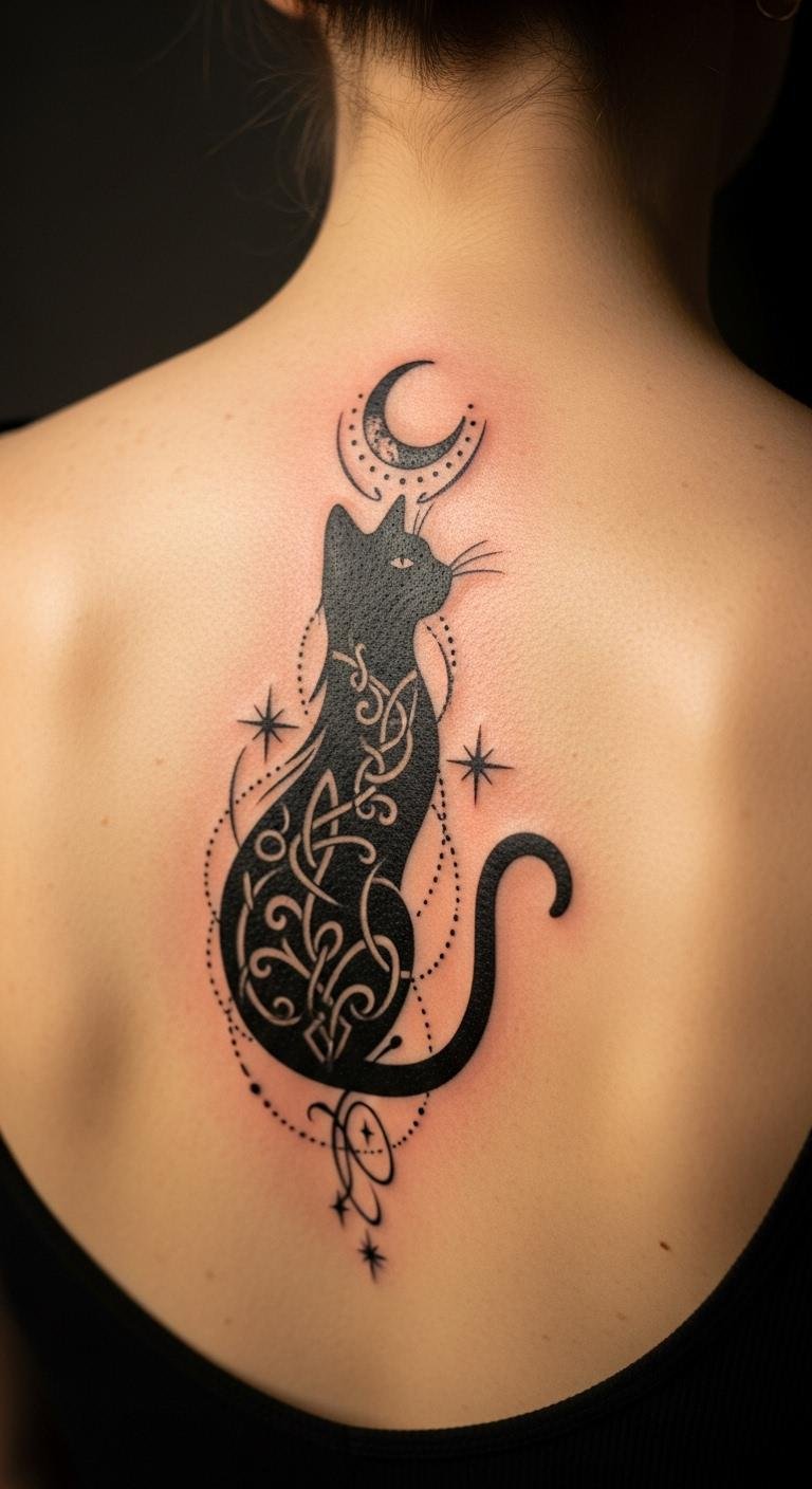 Combine elements for a timeless black cat tattoo. It lasts forever. Mix ideas on paper. With supplies you own. No extra cost. Blend concepts online. Tattoo on your back. Around $190. Choose classic pairs. Draw combos with tape. Easy actions. This tattoo ages well.
