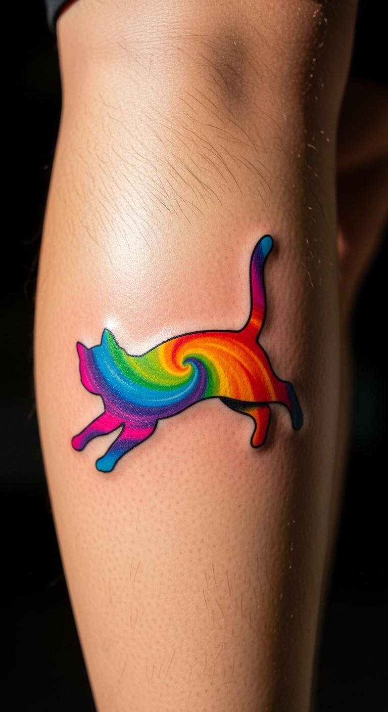 Add rainbows to a black cat for a fun twist. It mixes mystery with joy. Draw a cat with color stripes using markers at home. Keep it simple for practice. Download free coloring pages to start. Place it on your leg for visibility. Artists might charge extra for colors, so budget $250. Choose fade-resistant ink for longevity. Test colors with washable paints on your skin. It’s easy and cheap. This design brings positivity to your day.