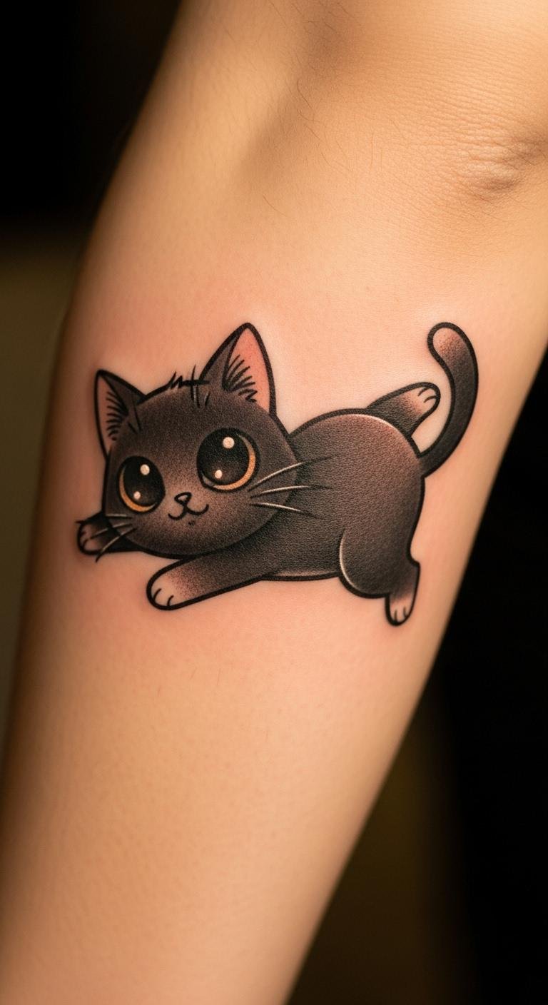 Opt for a playful cartoon black cat tattoo. It’s light-hearted and fun. Doodle a cat face with big eyes on paper. Use crayons you already own. This makes planning affordable. Find cartoon templates online for free. Put it on your forearm for easy access. Expect costs around $120 at a local place. Add extras like a smile for personality. Try drawing with eyeliner first to see how it looks. It’s quick and cost-free. This tattoo adds a smile to your routine.
