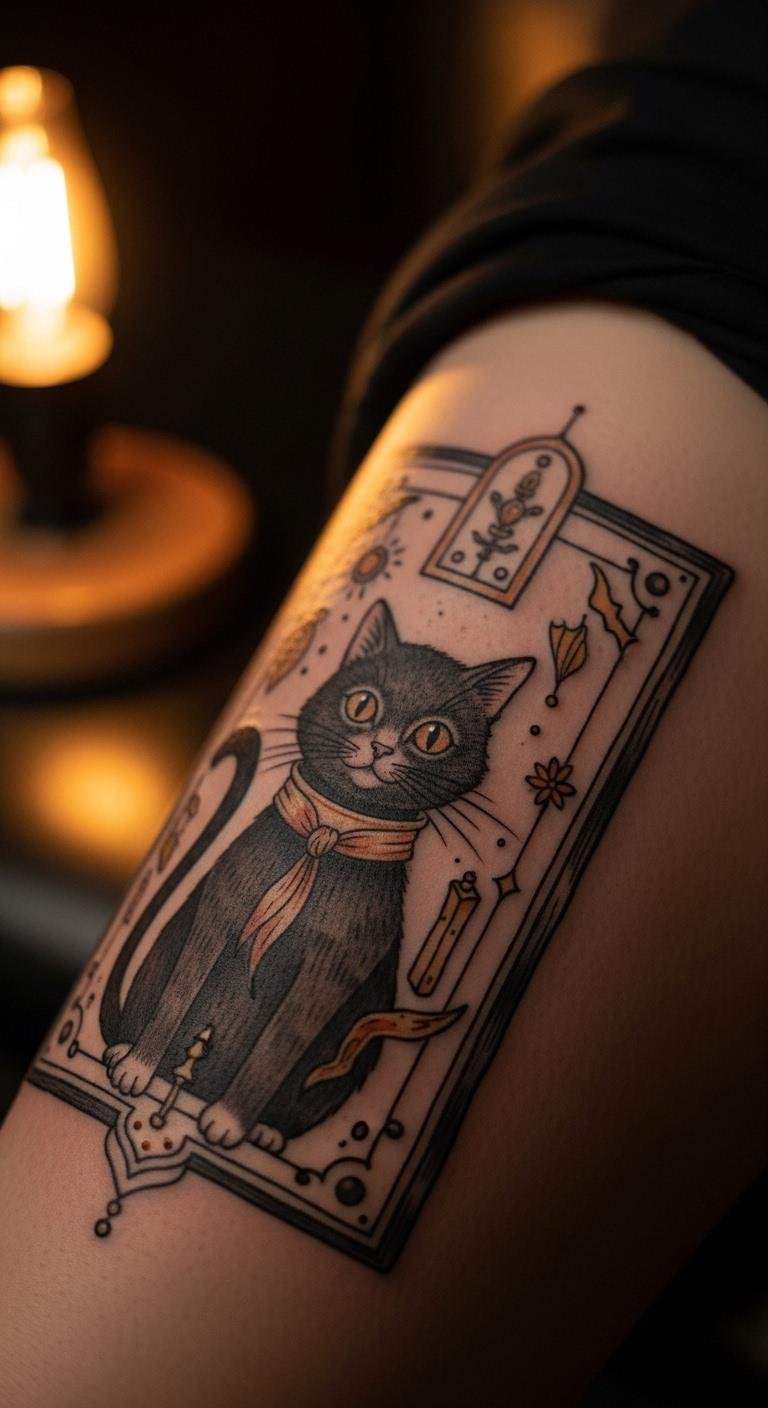 Go with a storybook black cat for that fairy-tale vibe. It’s nostalgic and sweet. Illustrate a cat scene on paper with markers. Use your existing supplies. This keeps costs down. Find illustration guides online at no charge. Tattoo it on your thigh for space. Expect about $200 for the work. Add book-like borders for extra charm. Practice with kid’s drawing books. It’s simple and engaging. This tattoo tells your own story.