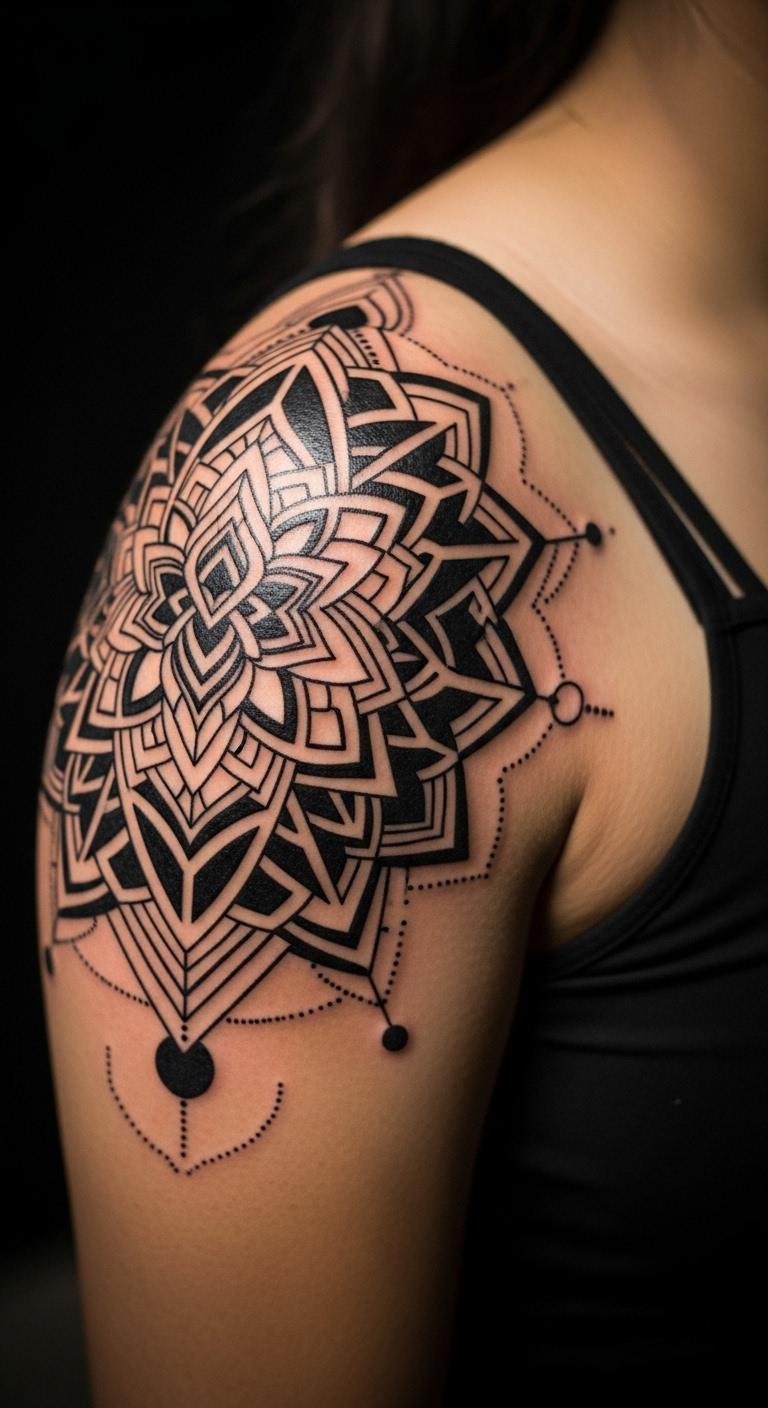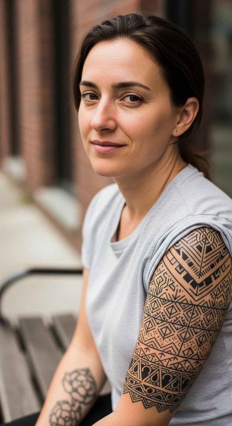 Black geometric tattoos bring sharp lines and shapes that catch the eye. Think triangles, circles, and patterns that fit anywhere on your body. Start with a small design on your wrist to keep costs low. Use online templates as inspiration and sketch ideas at home with a pen. A local artist might charge less for simple shapes, so shop around for deals. Bold patterns like these last for years with basic care. Mix in personal symbols for a unique touch. Keep it simple: clean the area before drawing. This style works for first-timers and adds a modern edge.