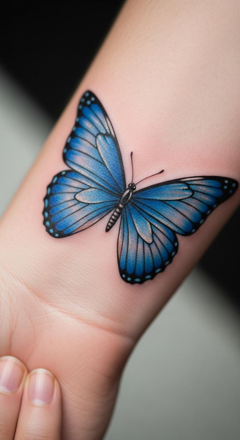 Blue butterfly on wrist tattoos offer a visible, everyday symbol. Think a blue design that moves with you. Ideal for constant inspiration. Trace your wrist with blue pencils to plan. Check for wrist-specific deals nearby. Keep it central for personal access. Bandages with blue designs work as testers. Compact tattoos save on price. This spot makes freedom a daily part.