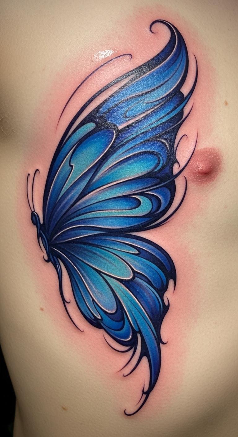 Blue butterfly on ribcage tattoos hide in plain sight. Think subtle blue details along your side. Good for private meanings. Practice on rib-shaped templates. Seek rib deals at trusted spots. Choose for close-to-heart vibes. Blue tape mimics the look cheaply. Minimal ink keeps it budget-friendly. This spot cherishes freedom quietly.