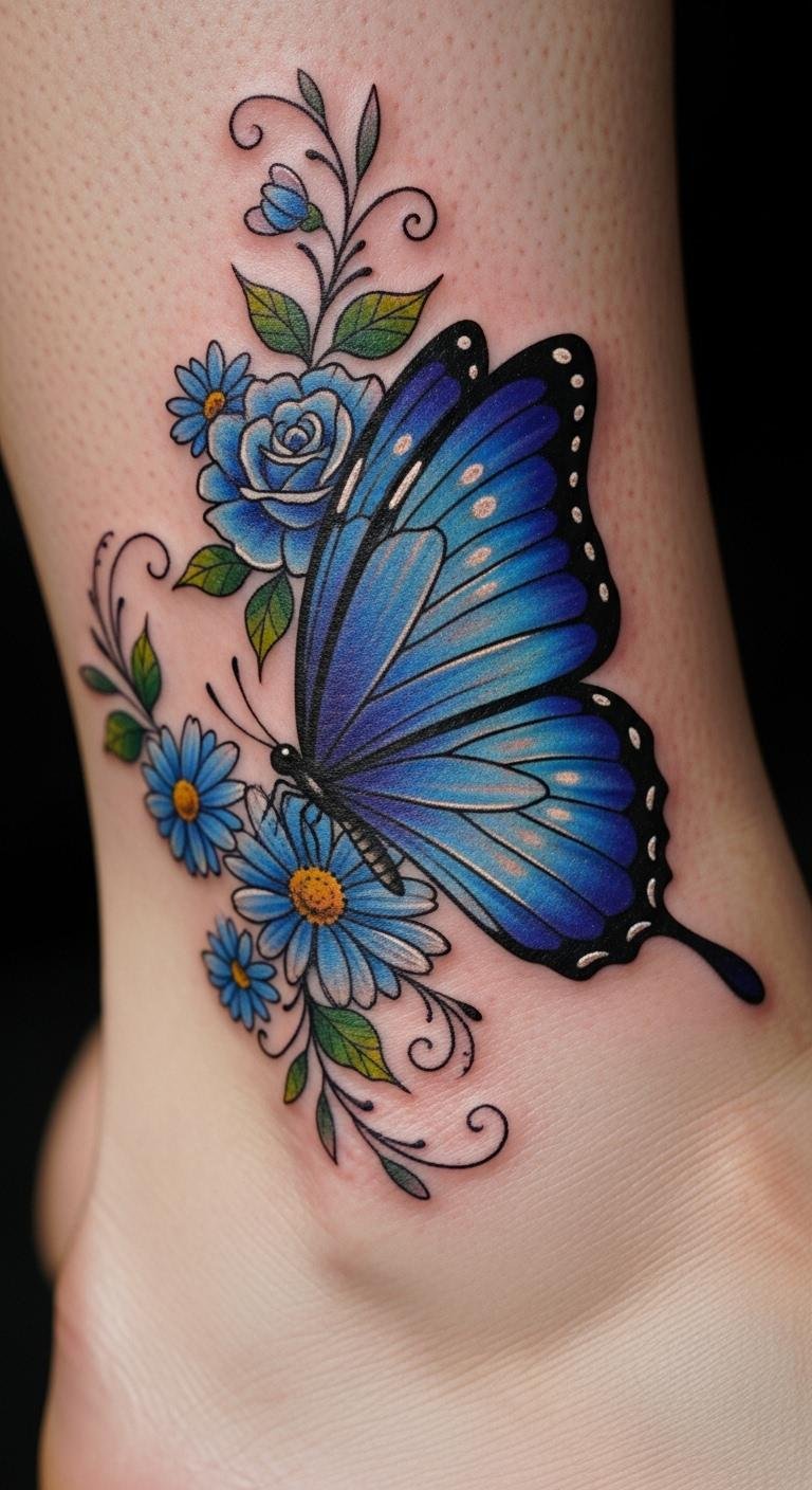 Blue butterfly with flowers tattoos combine butterflies and blooms for a nature vibe. See a blue butterfly next to delicate petals. This design adds a fresh, organic feel. Start by pressing flowers and sketching around them. Look for package deals at studios to save cash. Opt for your ankle to keep it subtle. Create a temporary version with flower stamps and blue ink. Pair simple elements for quicker, cheaper sessions. This helps you connect with freedom in a grounded way.