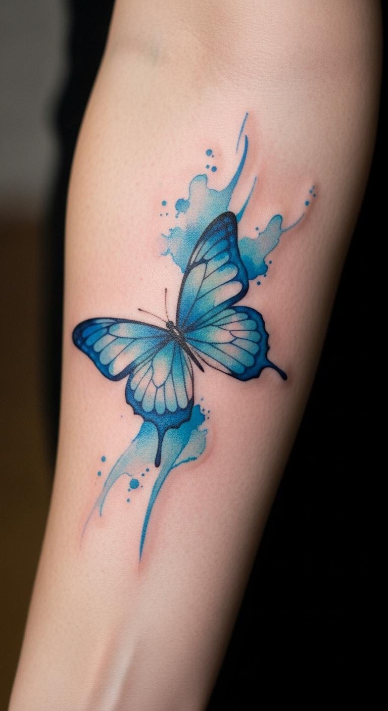 Go for a watercolor blue butterfly to capture a sense of calm and flow. The soft blends mimic real art on your skin. Draw inspiration with watercolors at home—grab a $10 set from a craft store and practice on paper first. Find an affordable artist online who offers this style for $80–$150 per session. Place it on your forearm for easy viewing. Add elements like faint clouds for a peaceful story. Use phone apps to overlay designs on photos of your body before deciding. This tattoo works as a stress reliever; ink it small to fit your budget. Try a DIY temporary with washable markers—apply and snap a pic to share. It’s a practical way to embrace tranquility without going all in.