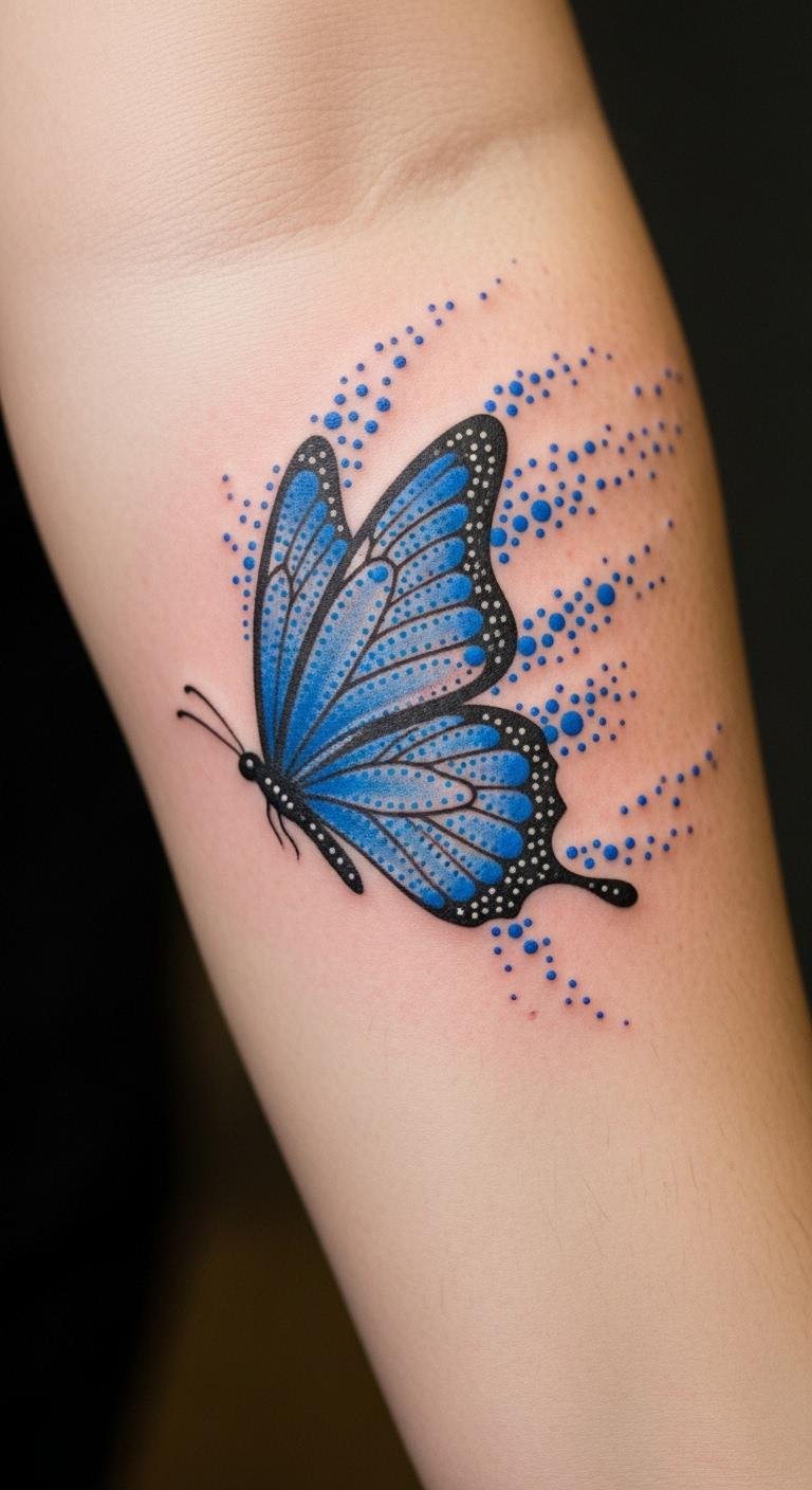 Add dots to a blue butterfly on your forearm for a sense of motion and freedom. It adds playfulness. Dot paper designs at home with pens—free start. Get it done for $70–$130. Make the dots tell your tale. Temporary dot stickers cost $3; try them on. This idea sparks joy daily. Experiment with dot tools simply.