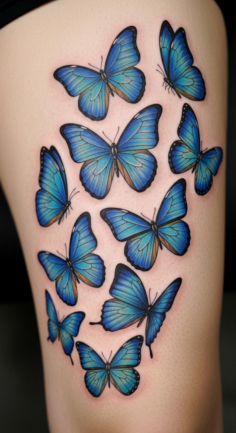 Group blue butterflies on your thigh to symbolize abundance and free spirits. They cluster like friends. Draw groups on fabric scraps—under $1. Book for $140–$220. Place for comfort in clothing. Add colors for variety. Cluster stickers online for $6; test the look. This design feels abundant.