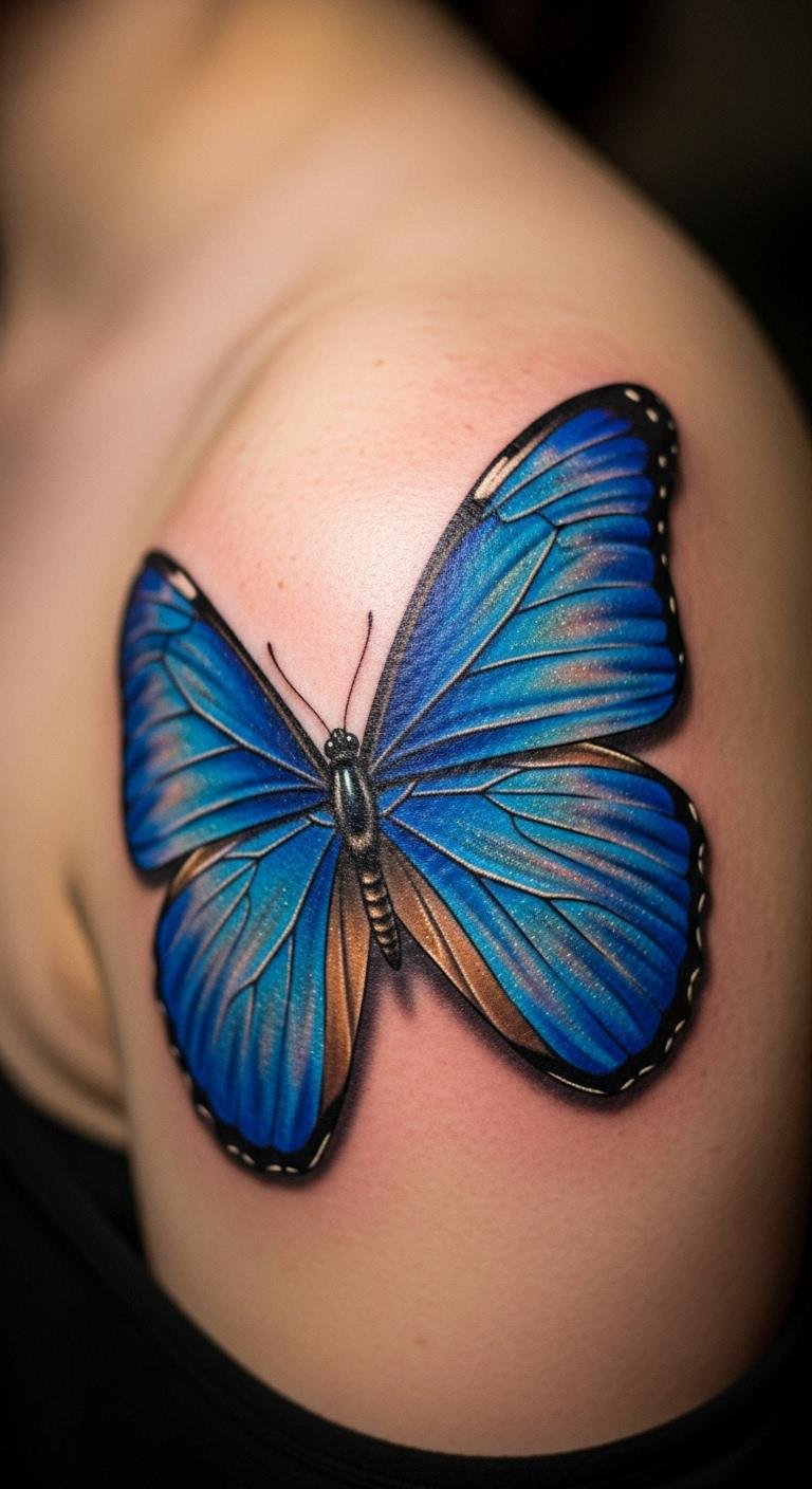 A realistic blue butterfly on your shoulder brings nature to life, symbolizing strength and hope. It looks like a real insect just landed there. Start by printing reference images from free online sources and trace them with pencils. Book a session at a nearby studio for $100–$200; many offer payment plans. Position it where clothes can cover it for work. Customize with extra details, like varied blue shades for your story. Use a mirror to test placements at home. For a low-cost trial, apply stick-on tattoos from drugstores—they’re $2 each and removable. This design serves as a personal badge of resilience. Keep it simple to save time and money.