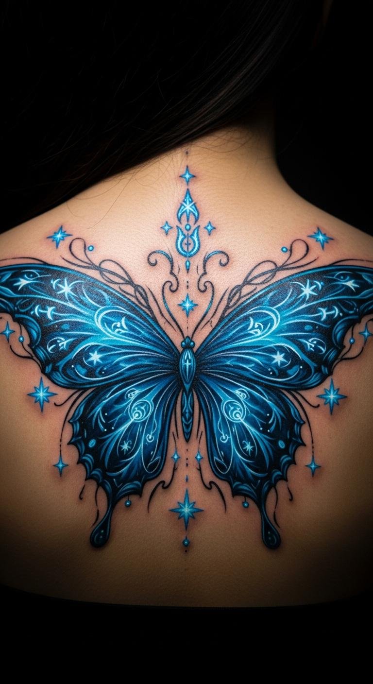 Amp up the fun with a fantasy blue butterfly, adding stars or swirls for a magical twist. It turns your skin into a storybook. Use colored pencils at home—buy a set for $5—to doodle designs first. Find artists who do custom work for $150–$250. Place it on your back for a grand reveal. Incorporate elements that reflect your adventures, like a spark. Try temporary kits online for $10; they let you play with ideas. This style sparks imagination—share photos to inspire friends. Keep costs down by starting small. It’s a creative outlet that feels achievable right away.