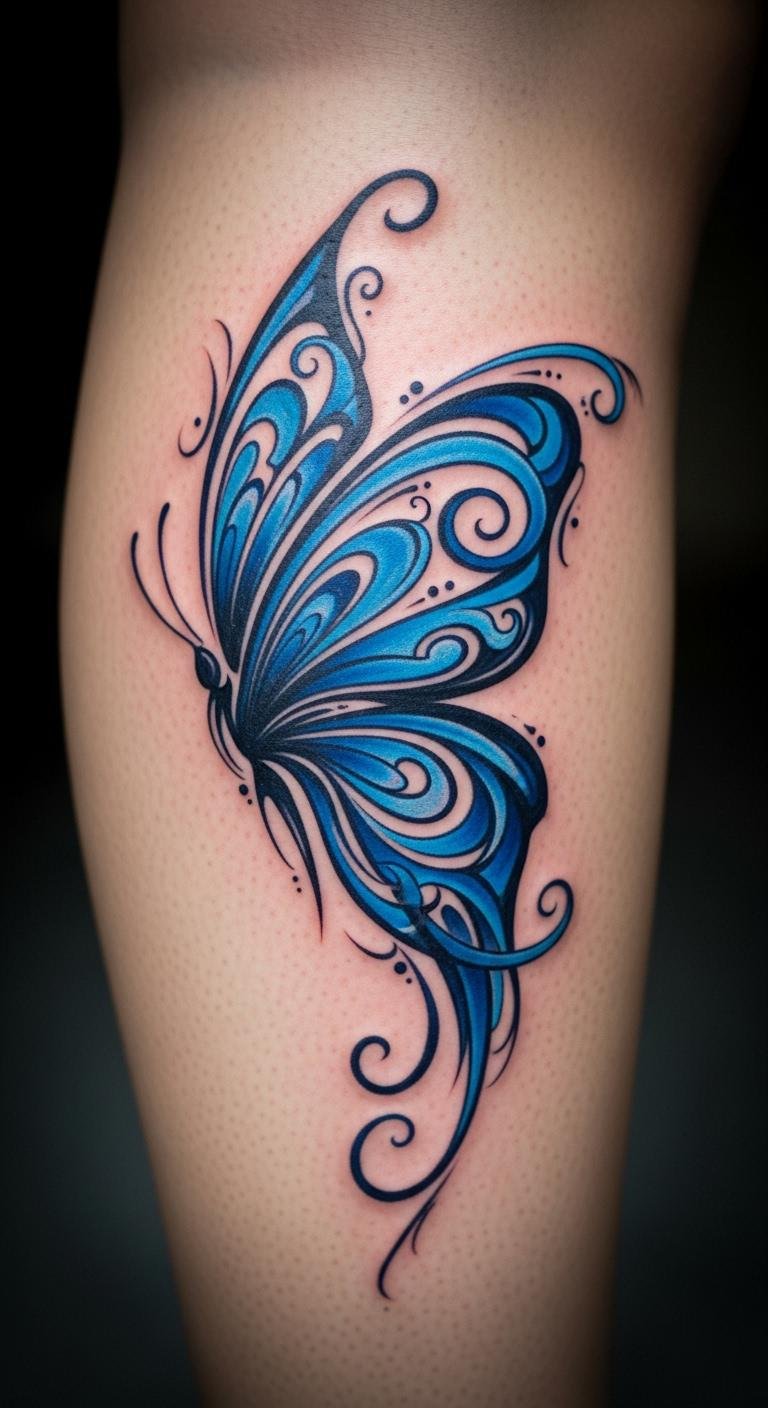 Go abstract with blue swirls in your butterfly for pure creativity. It lets your story flow freely. Experiment with swirling paints on paper—supplies under $10. Find artists for $100–$180. Place it on your leg for easy access. Add swirls that mean something to you. DIY with twistable markers for temporary fun. This style opens doors—try it first. Keep sessions short and affordable.