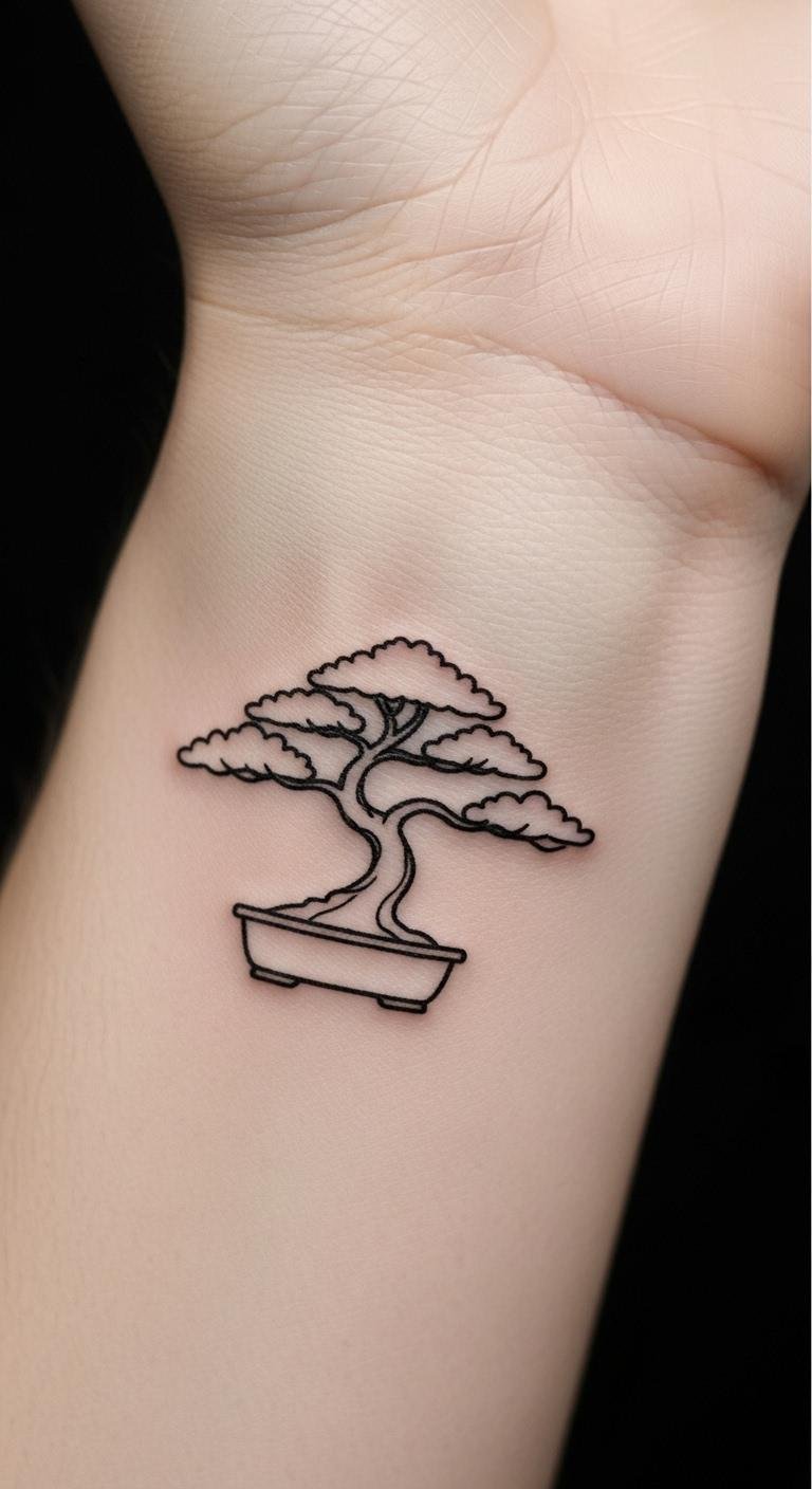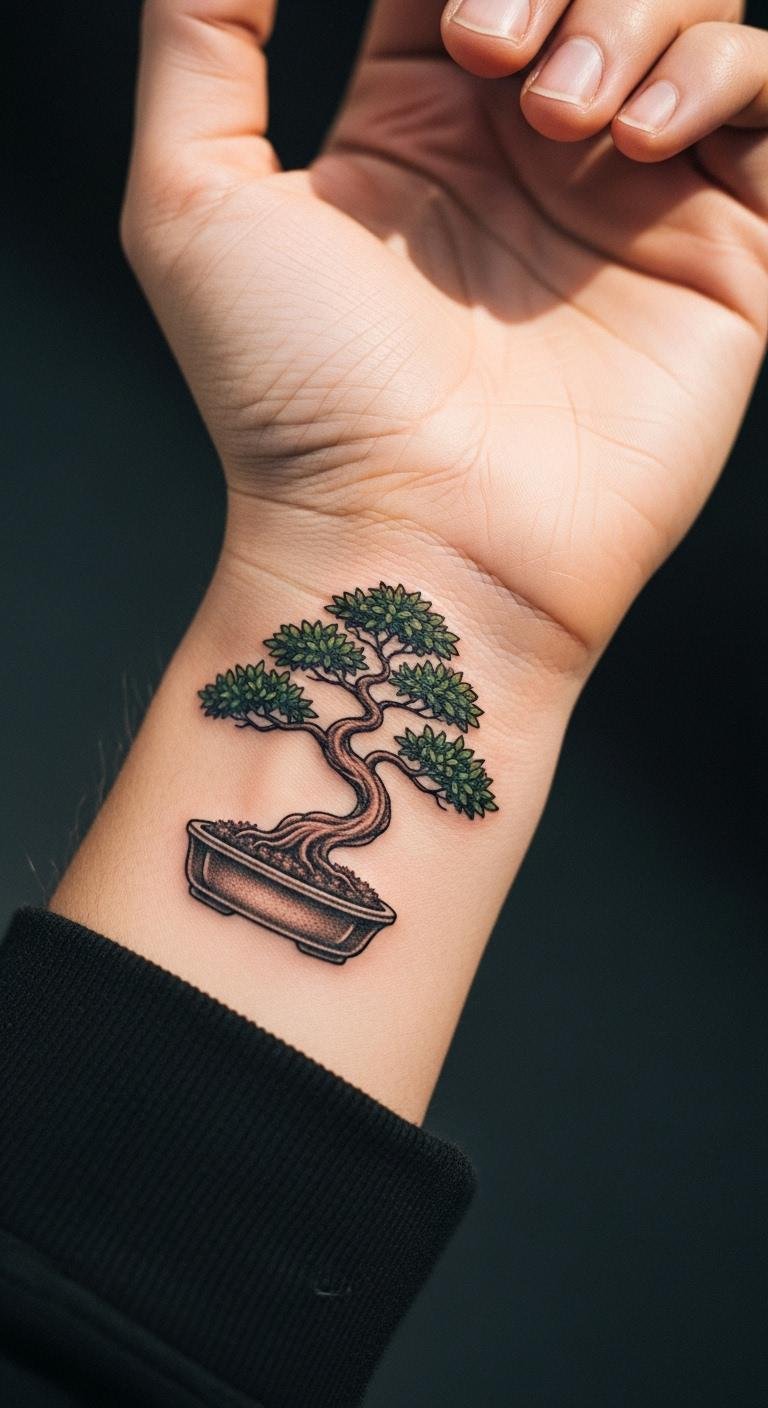A minimalist bonsai on your wrist keeps things simple and meaningful. Think of a small tree outline with just a few lines. This design fits daily life. You get a nod to patience without overwhelming ink. Start by sketching ideas at home with a pen and paper. Use free apps to draw your version. Pick an artist from local shops to save money. They charge less for basic work. Ask for thin lines to avoid extra cost. Wear it as a quiet reminder of balance. Try a DIY mock-up on your skin with henna. It washes off and helps you decide. This approach makes tattoo day easy. Go for local talent over big studios. You might pay under $100 for something small.