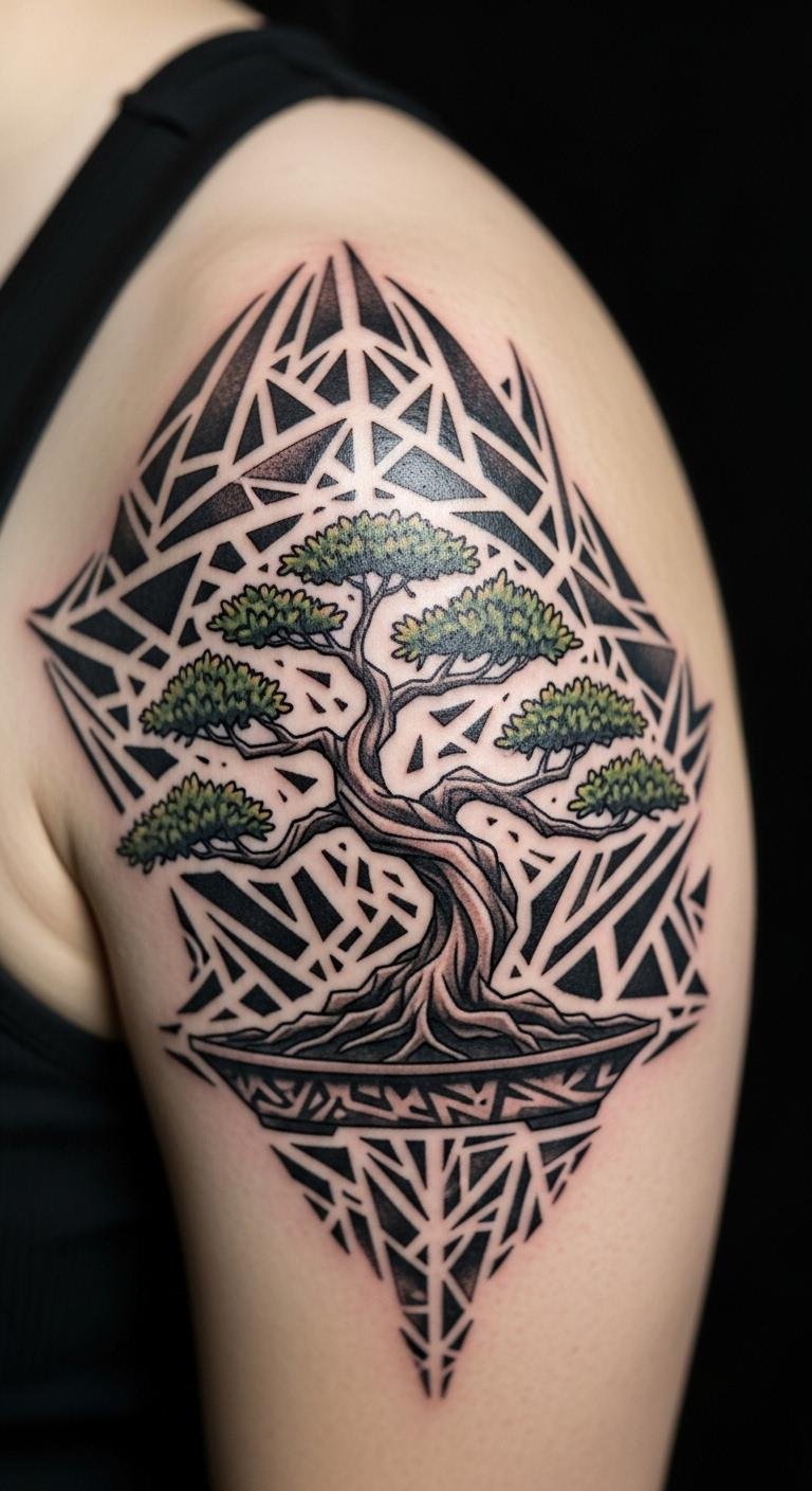 A geometric bonsai mixes shapes like triangles with tree forms. It adds a modern twist to classic vibes. Picture a tree inside a diamond grid. This style stands out yet feels calm. Draw inspiration from online free tools. Use graph paper to plan your layout at home. Find an affordable artist who does digital mocks. They can adjust ideas quickly. Aim for black ink to cut costs. Place it on your arm for easy access. Test the look with temporary tattoos from the dollar store. It lets you check fit before committing. This method keeps things budget-friendly. Focus on clear lines for longevity. Your design tells a story of harmony through simple forms.