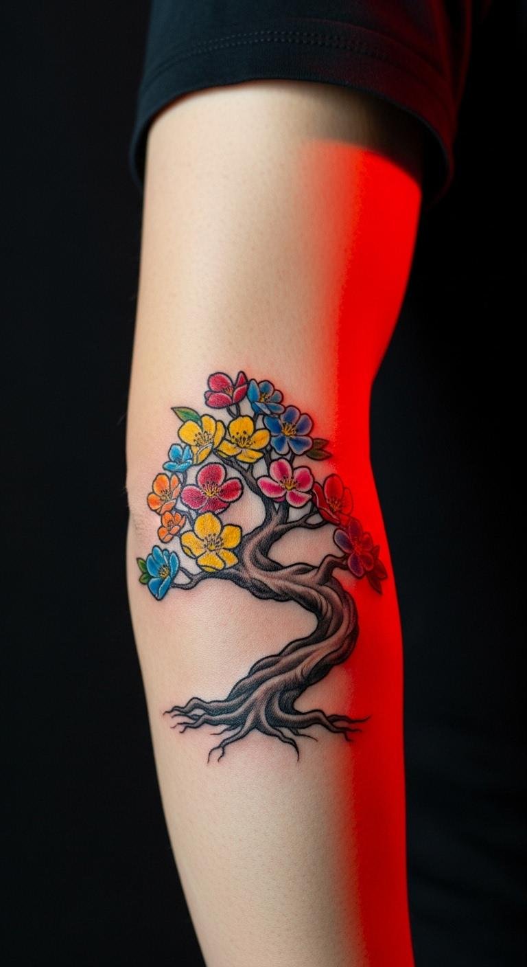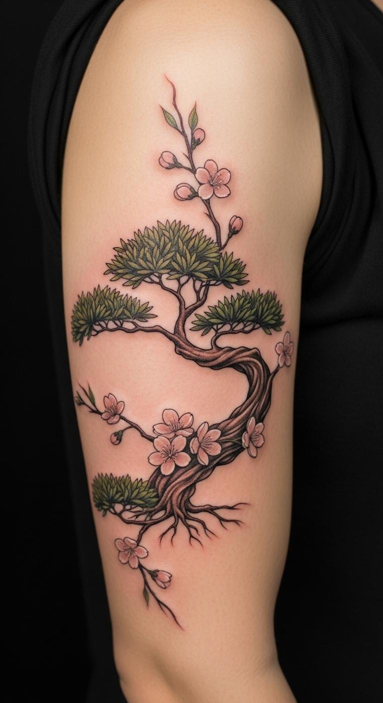 Add cherry blossoms to your bonsai for a seasonal touch. Flowers around the tree bring color and life. It shows beauty in change. Sketch petals using colored pencils at your desk. Free templates online make this fun. Choose a local shop for low-price sessions. Ask for just a few color spots to save. Put it on your back for a bigger canvas. Practice with washable markers on paper first. This step helps refine your vision. Keep costs down by sticking to one hue. Your tattoo becomes a personal bloom story. Try a fabric transfer on clothes to preview. It’s a cheap way to see the effect.