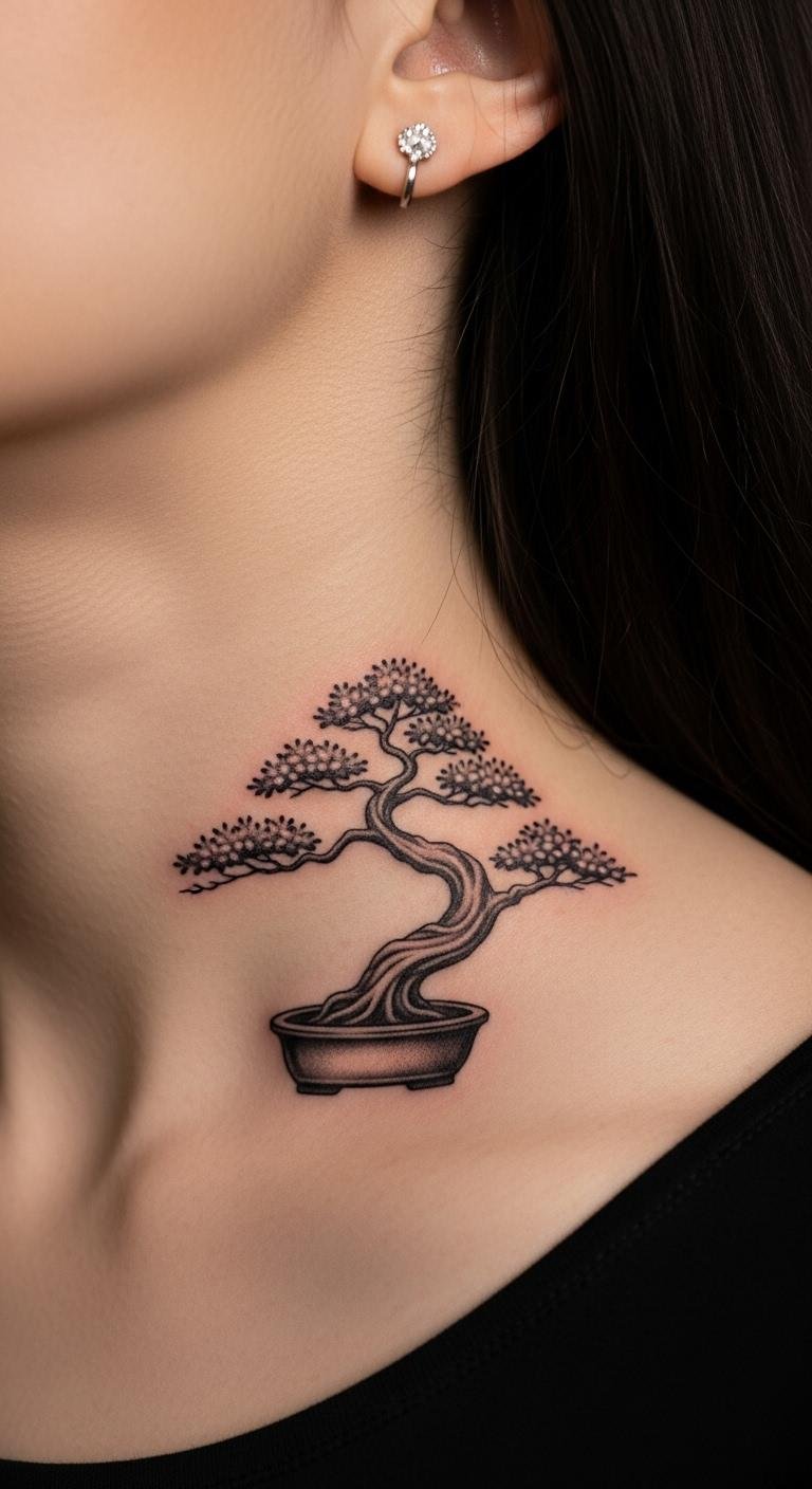 An elegant neck bonsai adds grace. Sleek lines suit the curve. It draws subtle attention. Outline on neck-shaped paper. Free templates match the area. Seek budget pros for fine work. Keep it linear for savings. Position at the base for balance. Use contour stickers to preview. They adhere easily. Your design enhances poise. Draw with precision tools.