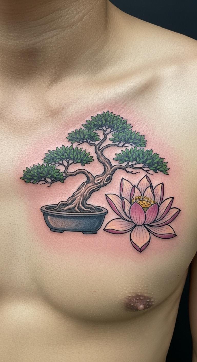 Pair your bonsai with a lotus for added symbolism. The lotus means purity alongside growth. It creates a harmonious blend. Draw both elements on plain paper. Free guides online simplify the process. Seek out local artists who offer discounts. Combine symbols to share the cost. Put it on your chest for a personal spot. Test with henna kits from the market. They’re cheap and temporary. Focus on shared lines to save on ink. Your tattoo links nature and spirit. Practice merging shapes with everyday markers.