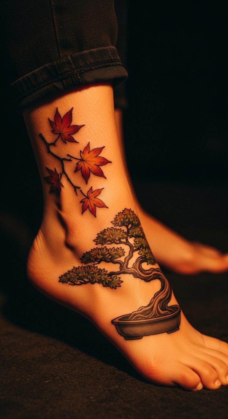 Incorporate autumn leaves for a seasonal bonsai. Leaves add warmth and change. It reflects life’s cycles. Color a few with crayons on paper. Free leaf templates speed things up. Find artists who do seasonal themes cheaply. Use just orange tones to lower costs. Anchor it on your ankle for subtlety. Apply temporary stickers to preview. They cost little and wash away. Your design evokes fall vibes. Sketch variations with found materials at home.
