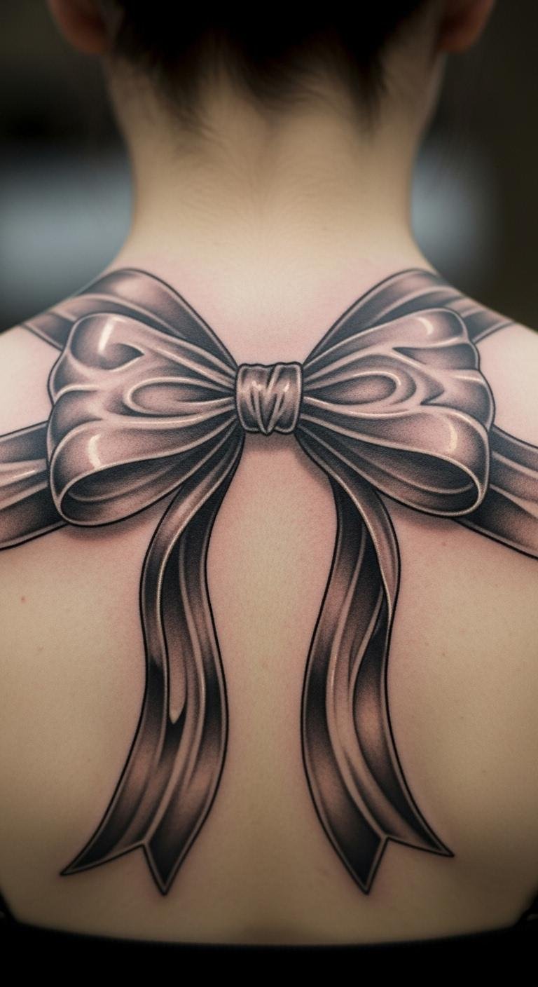 A larger bow on your back makes a bold statement. It represents overarching grace. Opt for detailed curves. Draw a big version on paper first. This scales it right. Artists might charge $120 for backs. Center it for symmetry. Add elements like vines for flair. Online resources help visualize it. This idea amplifies your presence affordably.