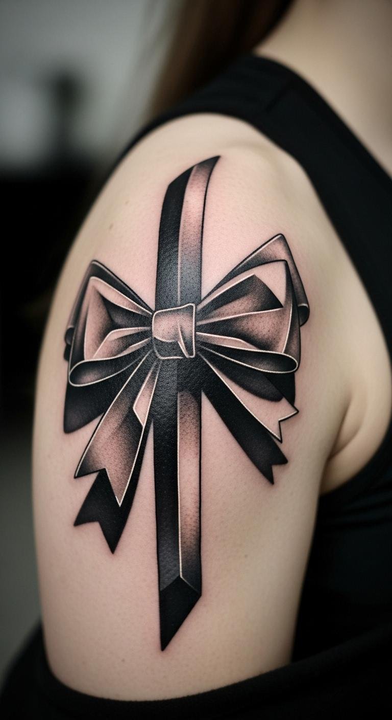 Add flowers to your bow for a burst of energy. This design shows resilience with pops of color. Pick red for passion or blue for calm. Try drawing it on with colored pencils first. It’s a cheap way to test ideas. Find artists who do colorful work at reasonable rates, often around $100. Place it on your shoulder for easy viewing. Mix in local blooms for a personal story. Use phone apps to color in designs before committing. This keeps things fresh and within budget.
