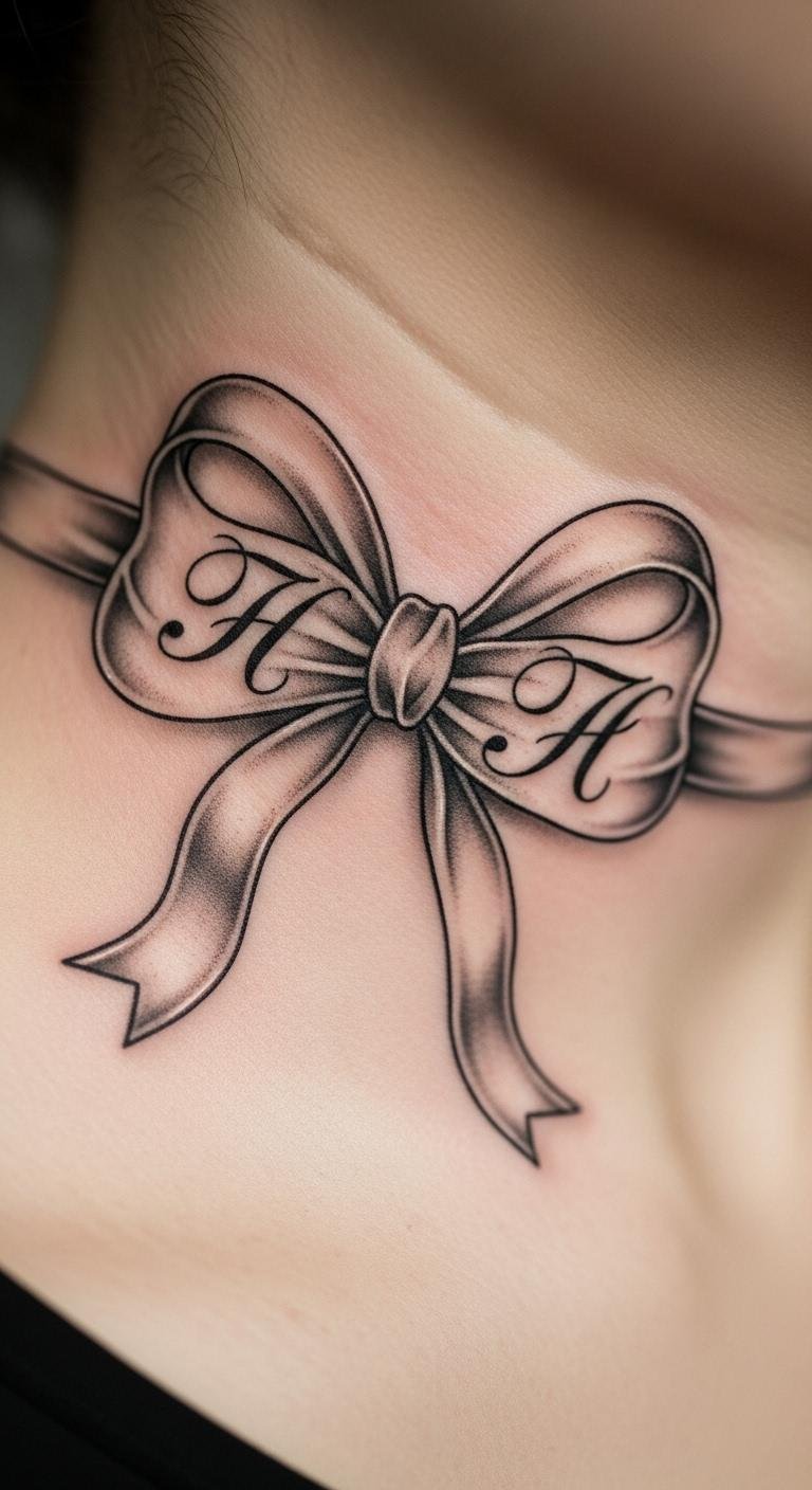 A bow along your collarbone offers elegant exposure. It embodies grace in a prominent spot. Use thin lines for delicacy. Sketch it over your collarbone with a marker. This previews the flow. Budget sessions run about $60. Angle it for your body’s curve. Wear low-neck tops to highlight it. Free apps assist with placement. Make this a statement without fuss.