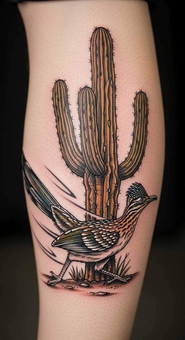 Cacti with roadrunners add action to your calf, like a desert chase. It’s lively. Pay $200. Draw the bird simply. Pair with the plant. Calf is practical. Ink holds strong. Customize the pose. Lotions maintain it. Two sessions max. Bring energy to ink.