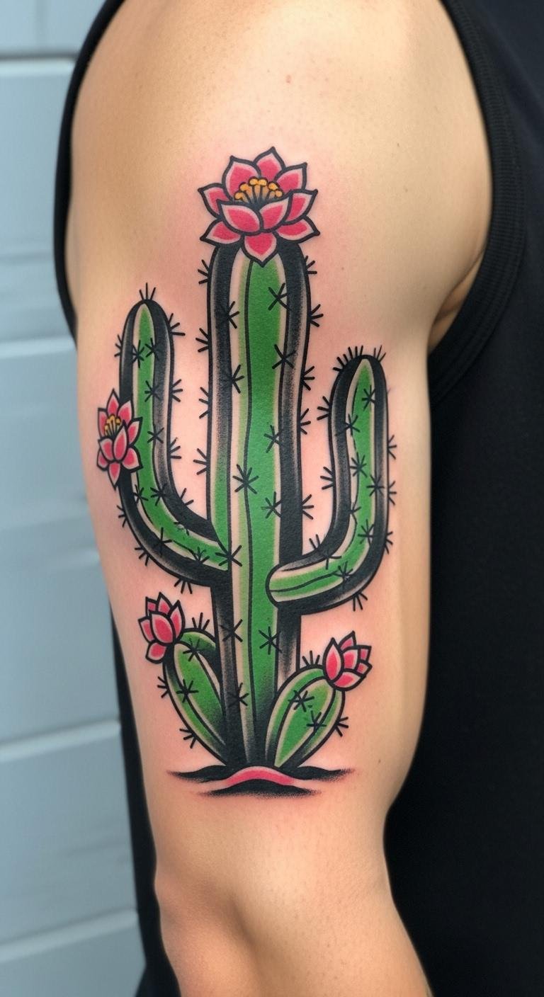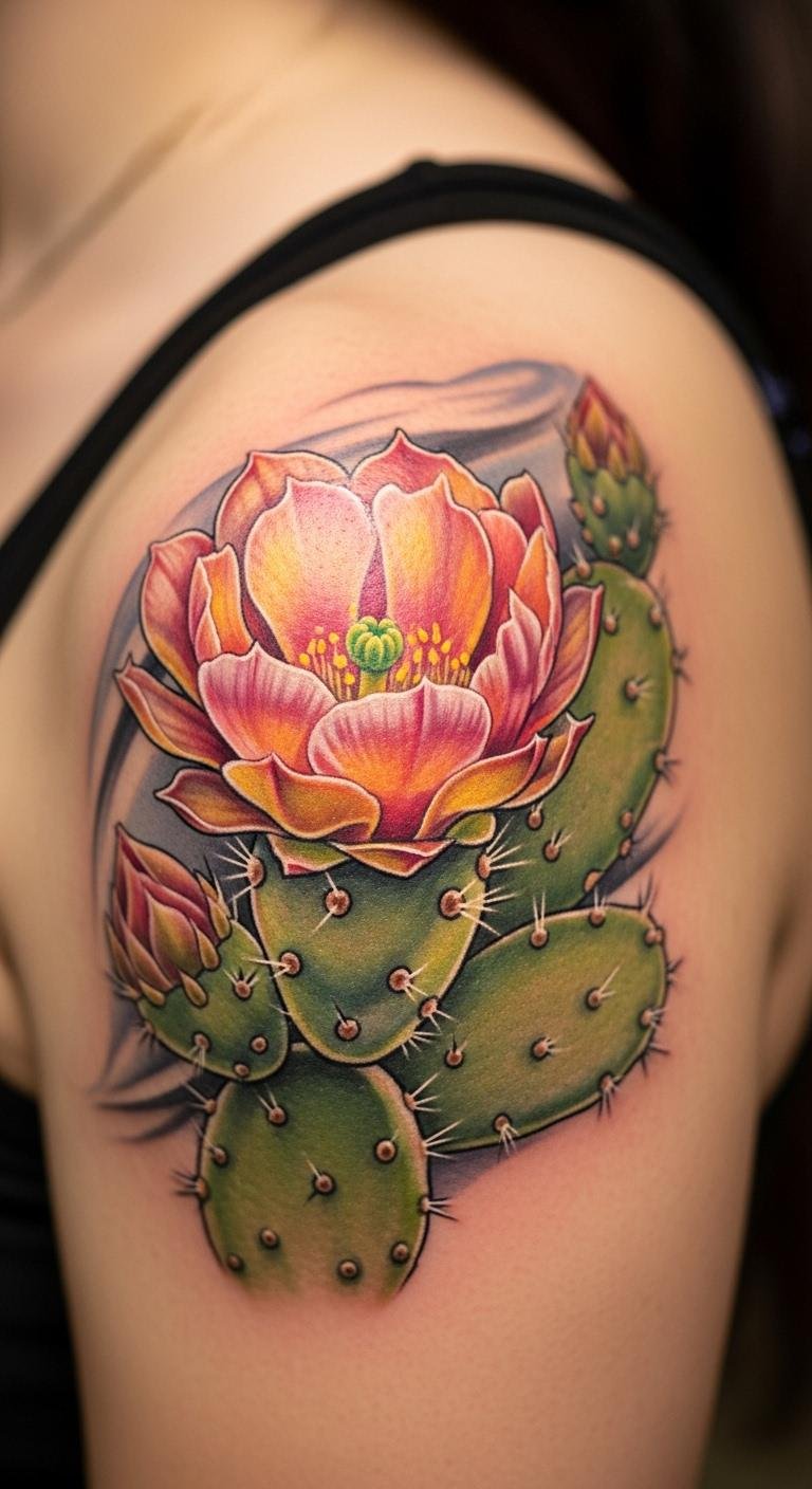 Feminine cactus flowers soften the plant on your shoulder, with petals and grace. It’s empowering. Cost $130. Sketch flowers lightly. Use pastels for ideas. Shoulder heals fine. Colors brighten it. Add bows if you like. Basic creams help. Quick ink session. Show your strength.