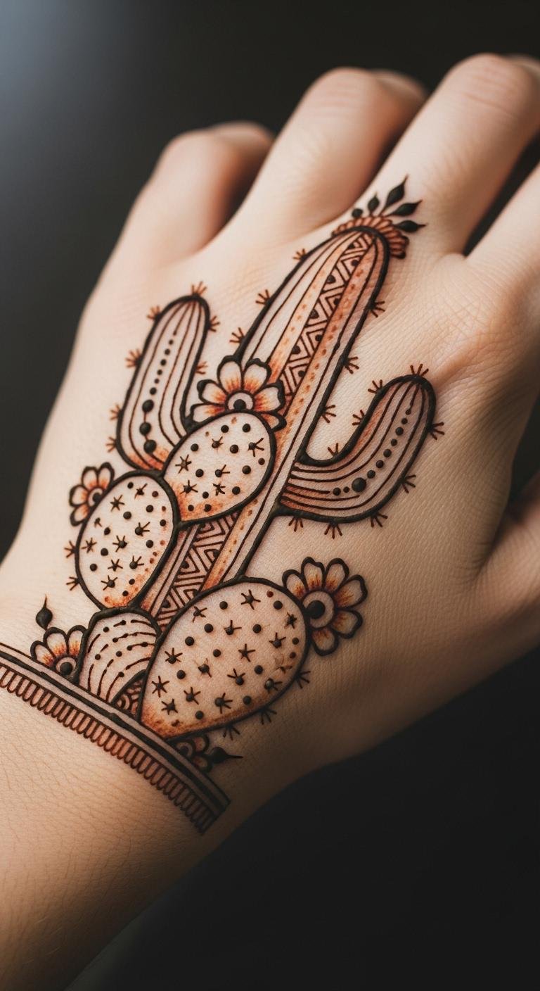 Temporary henna cacti test the waters on your hand, lasting weeks. No commitment needed. Cost under $20. Mix henna paste at home. Apply with a cone. Hand is simple. It washes off. Add designs freely. No aftercare needed. Do it yourself. Try before permanent.