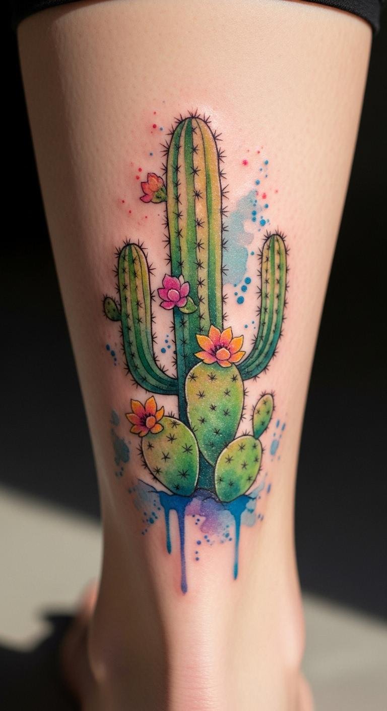 Watercolor cacti bring bright, flowing colors to your skin, like a painted desert bloom. Picture soft blues and greens on your bicep. This style feels artistic and fun. Look for deals at local shops for around $200. Practice with colored markers on your hand at home. Blend shades lightly for a test run. Choose spots that don’t hurt much, like your upper arm. The colors pop but need sun care to last. Add a flower for extra flair. Use affordable lotions to keep hues vivid. A single session might do it. This design tells a story of growth. Test with wash-off tattoos first. It’s perfect for showing personality.