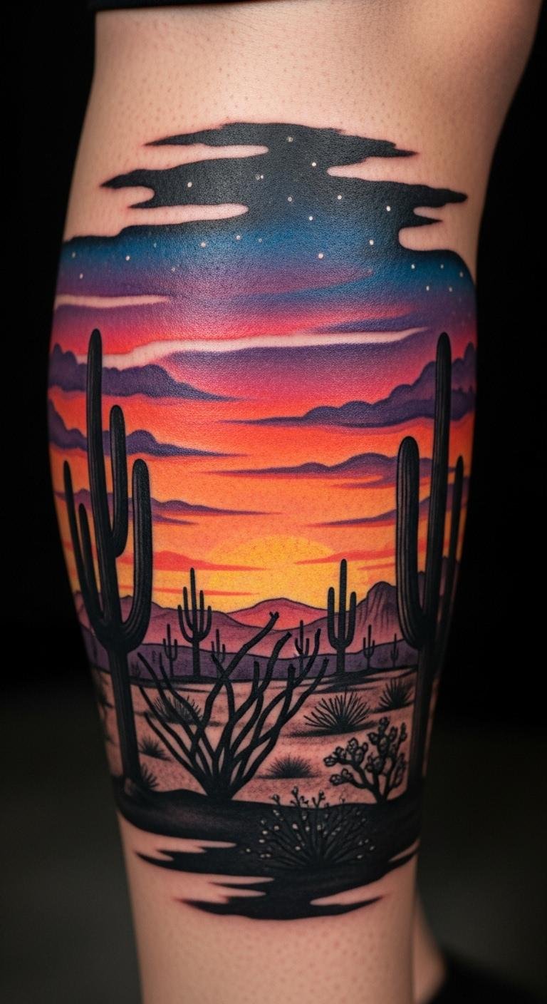Desert sunset cacti mix plants with fiery skies on your calf, creating a scene. Reds and oranges make it vivid. Budget around $200. Paint a sunset with watercolors at home first. Layer colors step by step. Opt for lower leg for easier sessions. Protect from sun to keep colors. Add a cactus in the foreground. Basic lotions help maintenance. It takes a couple hours. This tattoo paints your adventures.
